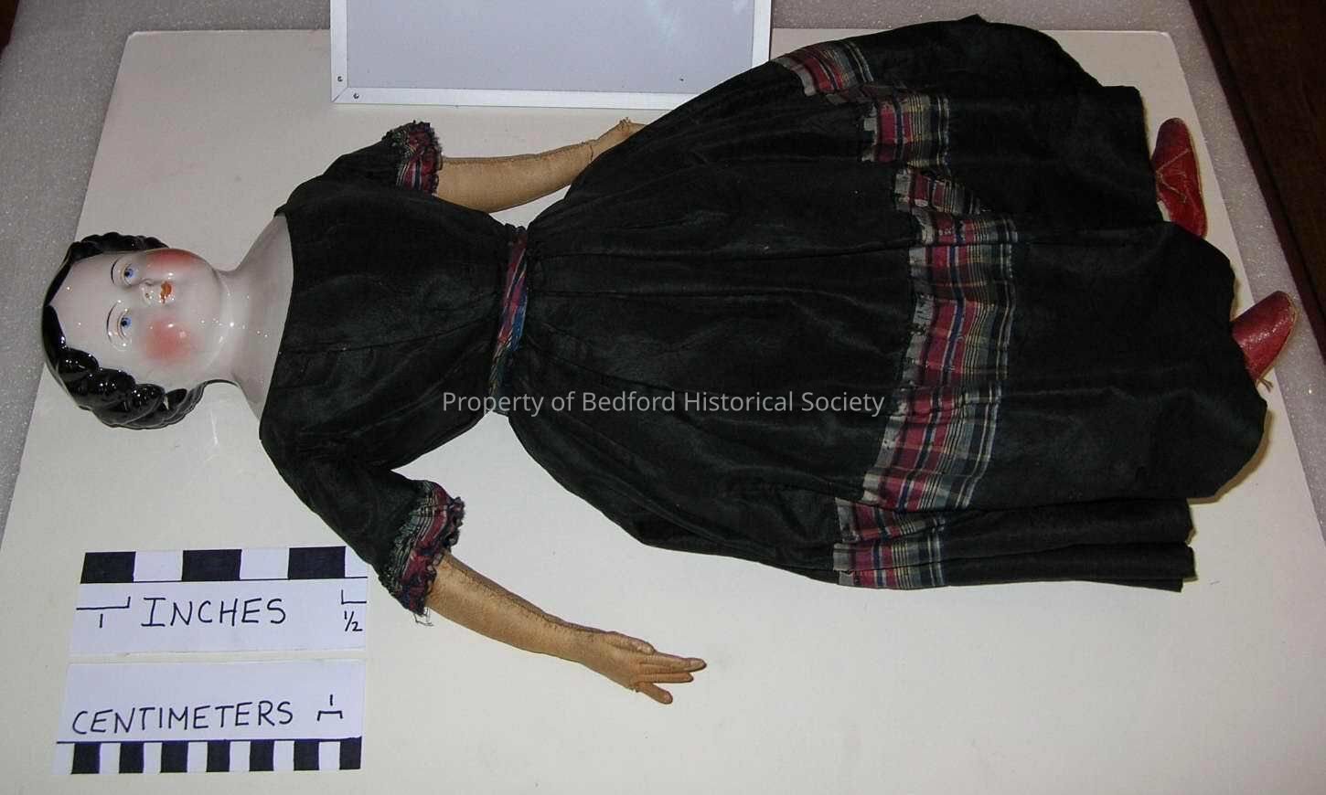 on card: "China head doll, Black painted hair, Black silk, open yoke + short sleeve dress with reddish band on skirt--leather arms + red leather shoes, late nineteenth century ca 1859"
