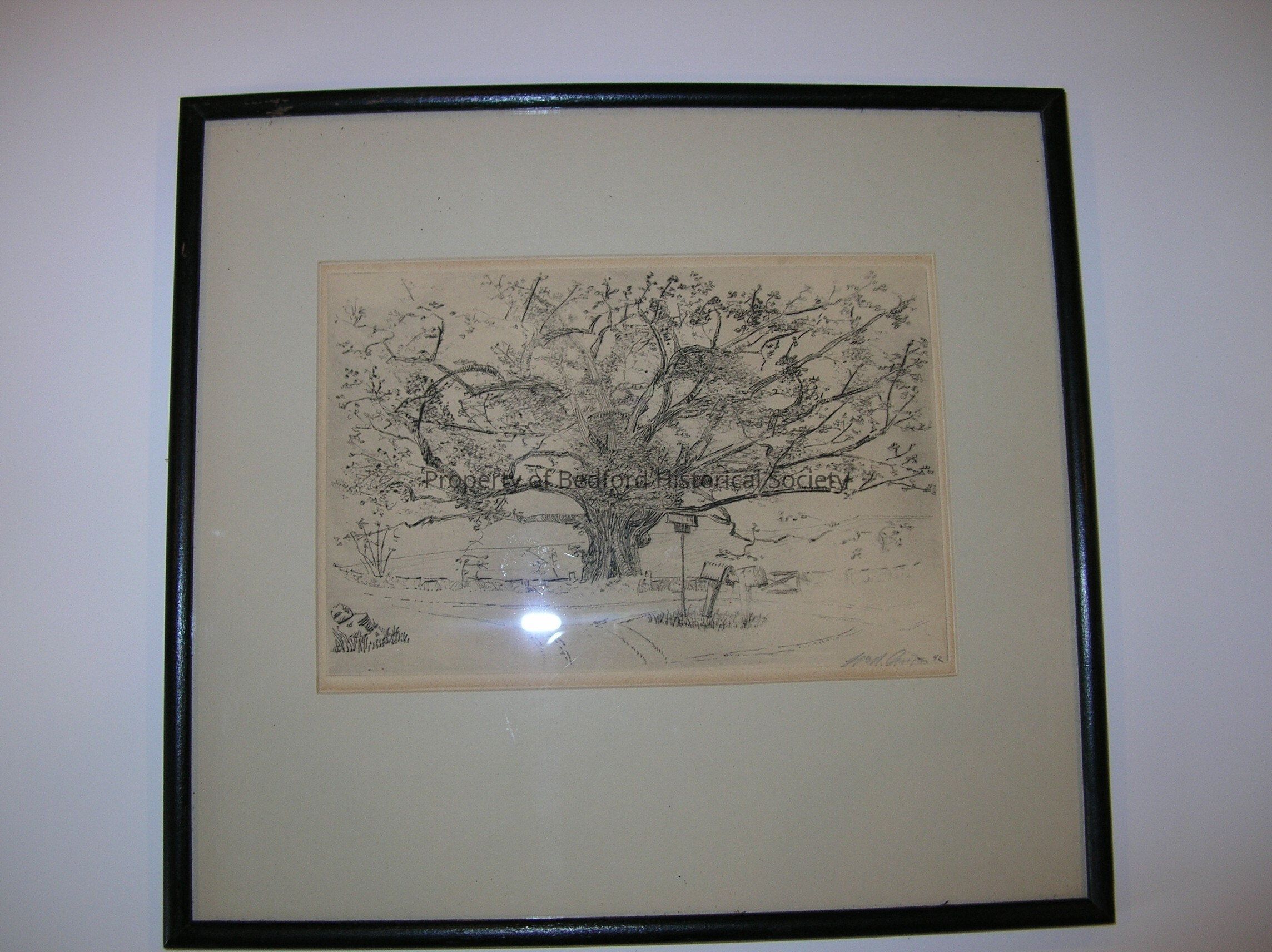 Framed drawing of the Bedford Oak. Marsh family item. 1942.