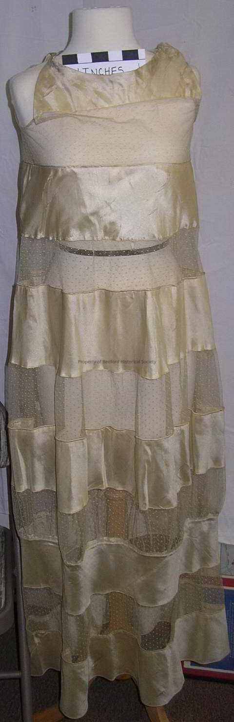 Cream satin dress with net inserts, handmade, Note attached: reads: 'Julia's graduation dress, 1916. Under it I wore a home made slip made by Lettie, a petticoat, a corset cover, home made panties, corset and my first silk shirt. Was it hot!' Worn by Julia Hoyt Hull.