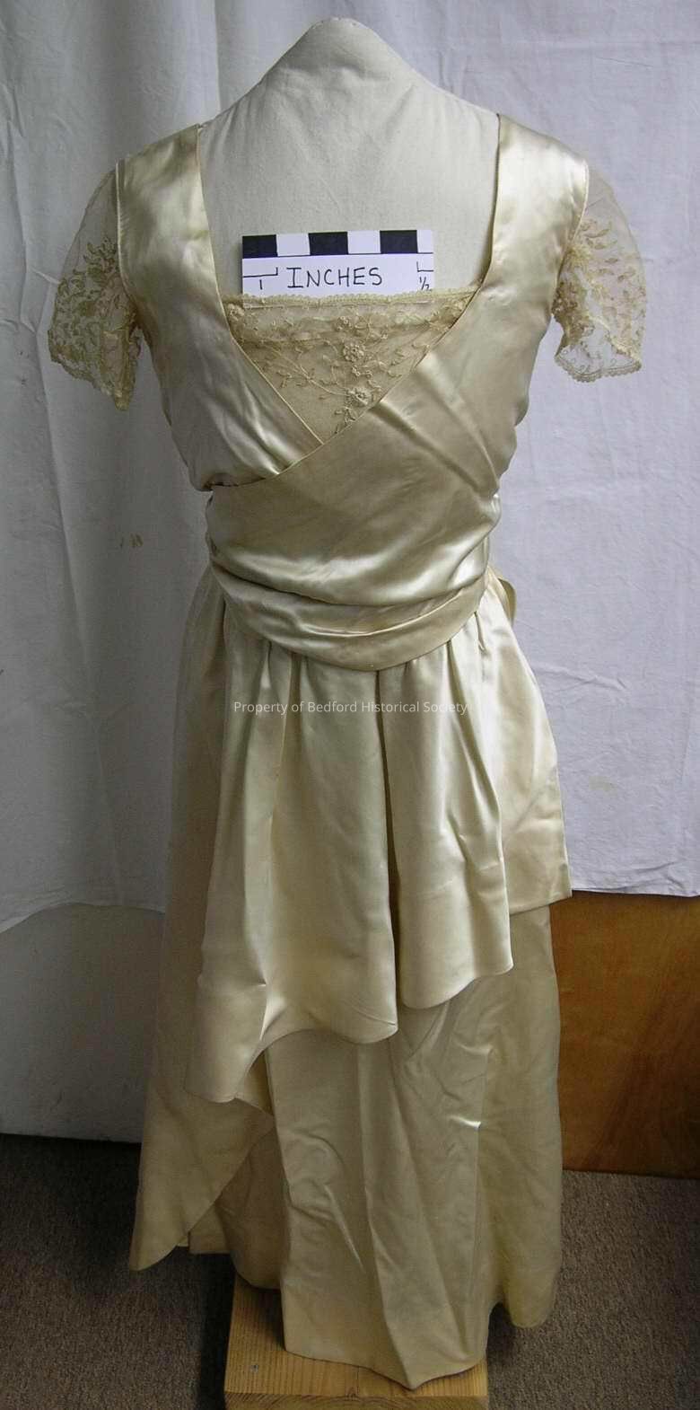 Wedding Dress, circa 1915, ivory satin, surplice bodice, short sleeves and neckline insert of embroidered net, gathered ankle length skirt with diagonal drapery, very good condition.