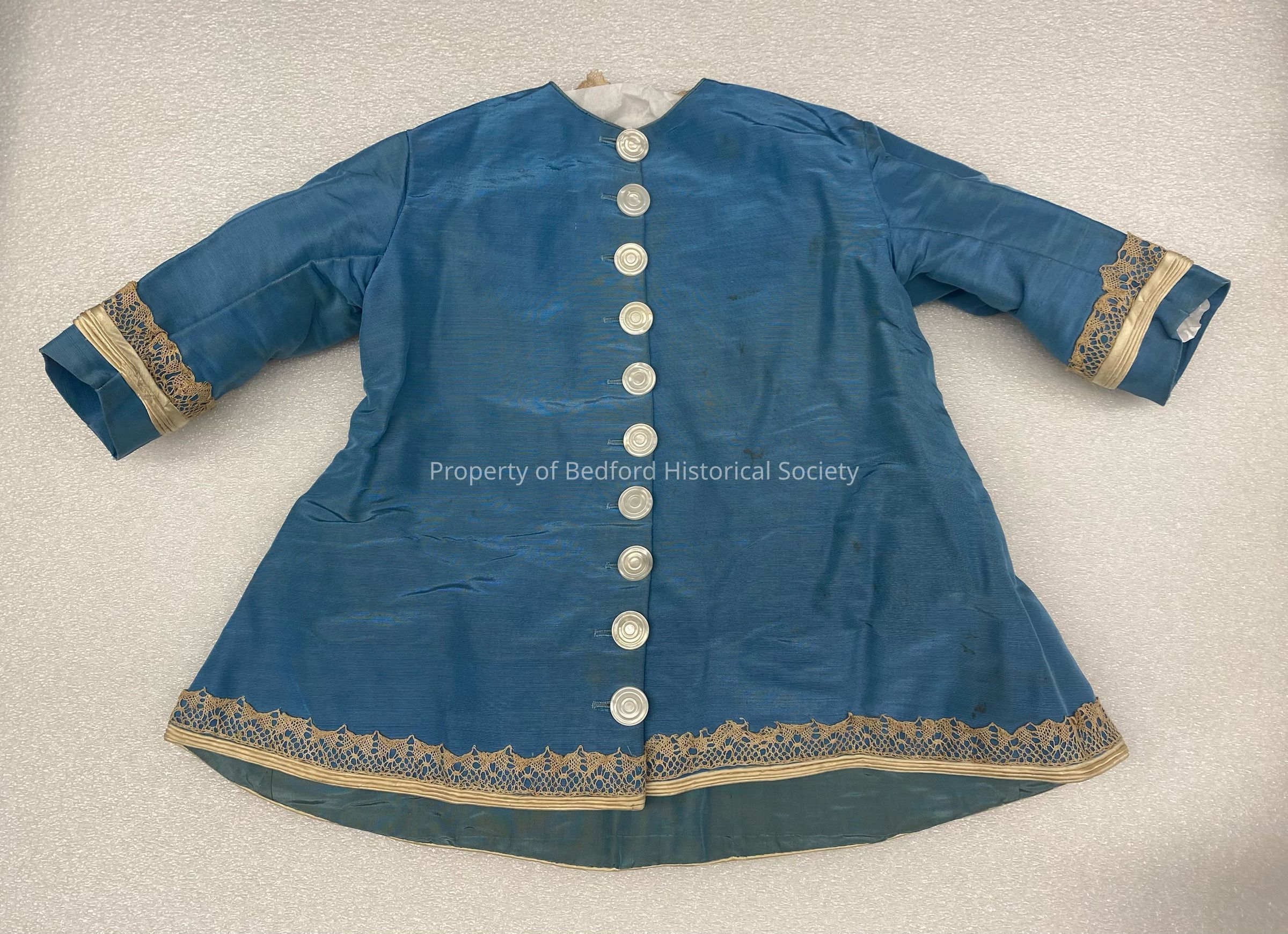 blue silk taffeta child's dress or coat with lace trim around cuffs and bottom, mother of pearl buttons, and green ribbon in back, c. mid/late 1850s