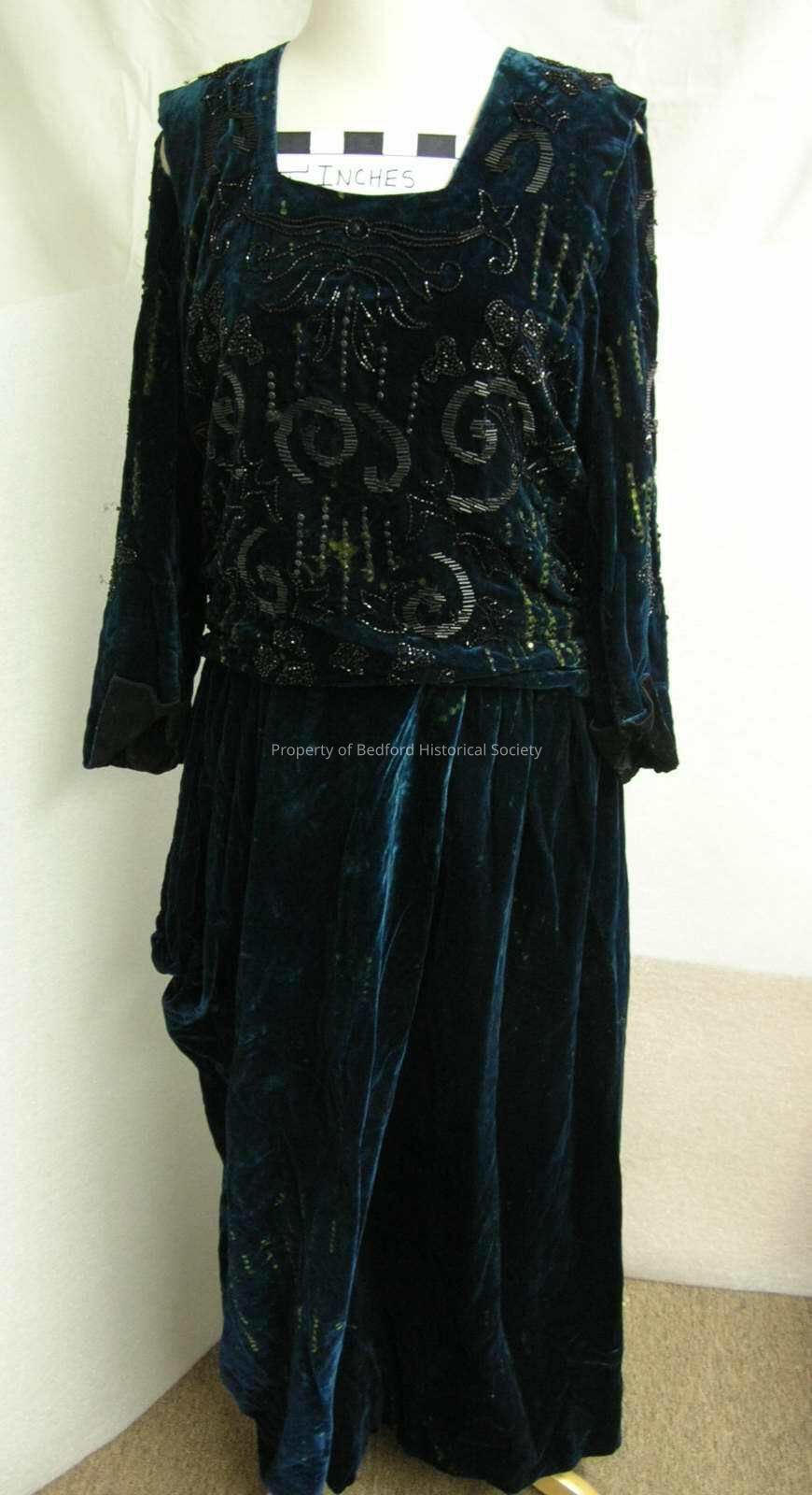 Teal velvet dress, 1920s, densely embroidered with long black bugle beads, flat round beads and black round beads, boxy cut, sleeveless, overblouse loose in front, long sleeves attached to the underdress, front tabard panel, good condition except for beadwork causing unusual oxidation.