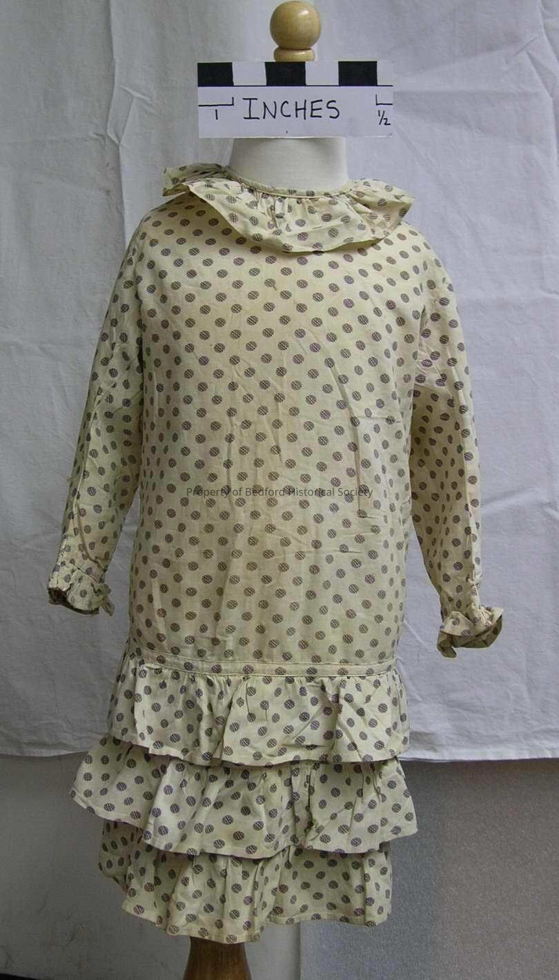 Child's dress, white cotton printed with purple dots, ruffle bottom, 1880s.