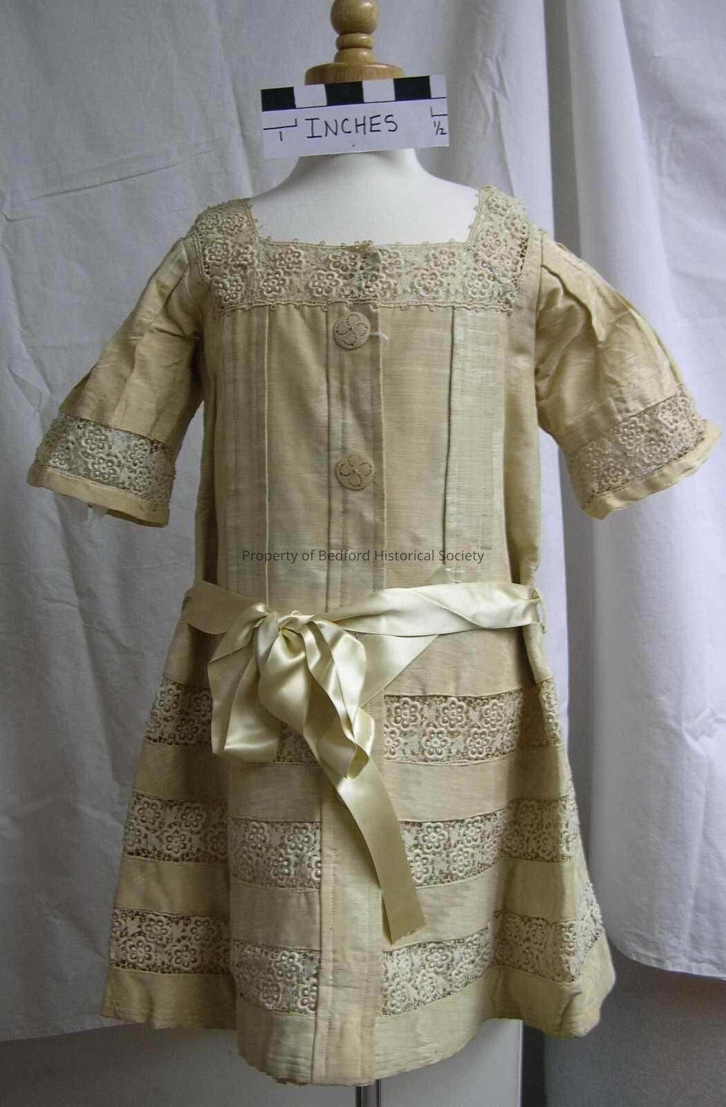 Ornate child's dress, late 19th century, of heavy moire trimmed with bands of large scale crochet lace at the square neck, flared short sleeves, and in three bands at the skirt, lined with ivory satin and ivory taffeta trimmed with the self ruffle, buttoning down the front with large buttons of mother of pearl pierced and incised with foliate scrolls, with a sash (not original) of duchesse/rose point lace.
