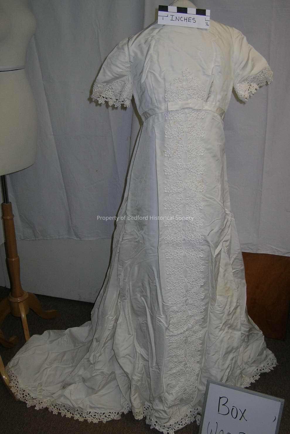 Empire style wedding dress (A.08.65A), circa 1960, Marshall Field (of Chicago) label, full length chapel train, bateau neckline, short sleeves, trimmed down the front with a band of Schliffli style lace, Watteay pleat at the back, stiff wide hairband-style headpiece (A.08.65B) of Schliffli style lace with puff of bright while tulle, very good condition, some stains.