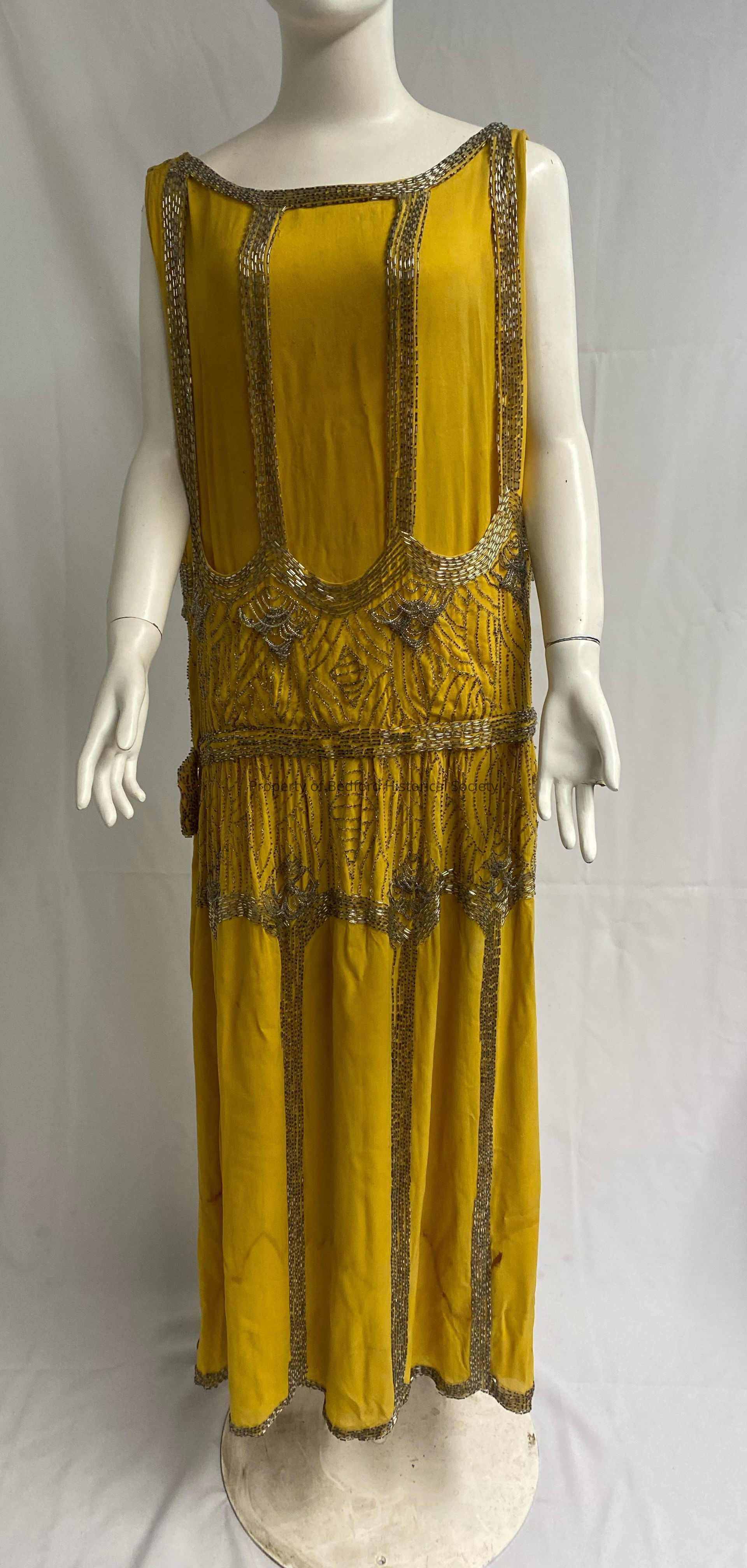 Object Label for Bustles and Bloomer Exhibition: Beaded yellow Evening dress, early 1920's. Saffron silk crepe sewn with bands of heavy crystal and bugle beads. This evening dress is a good example of the transition between the fashion of the 1910's and the abbreviated flapper dress of the mid-to-late 1920's.