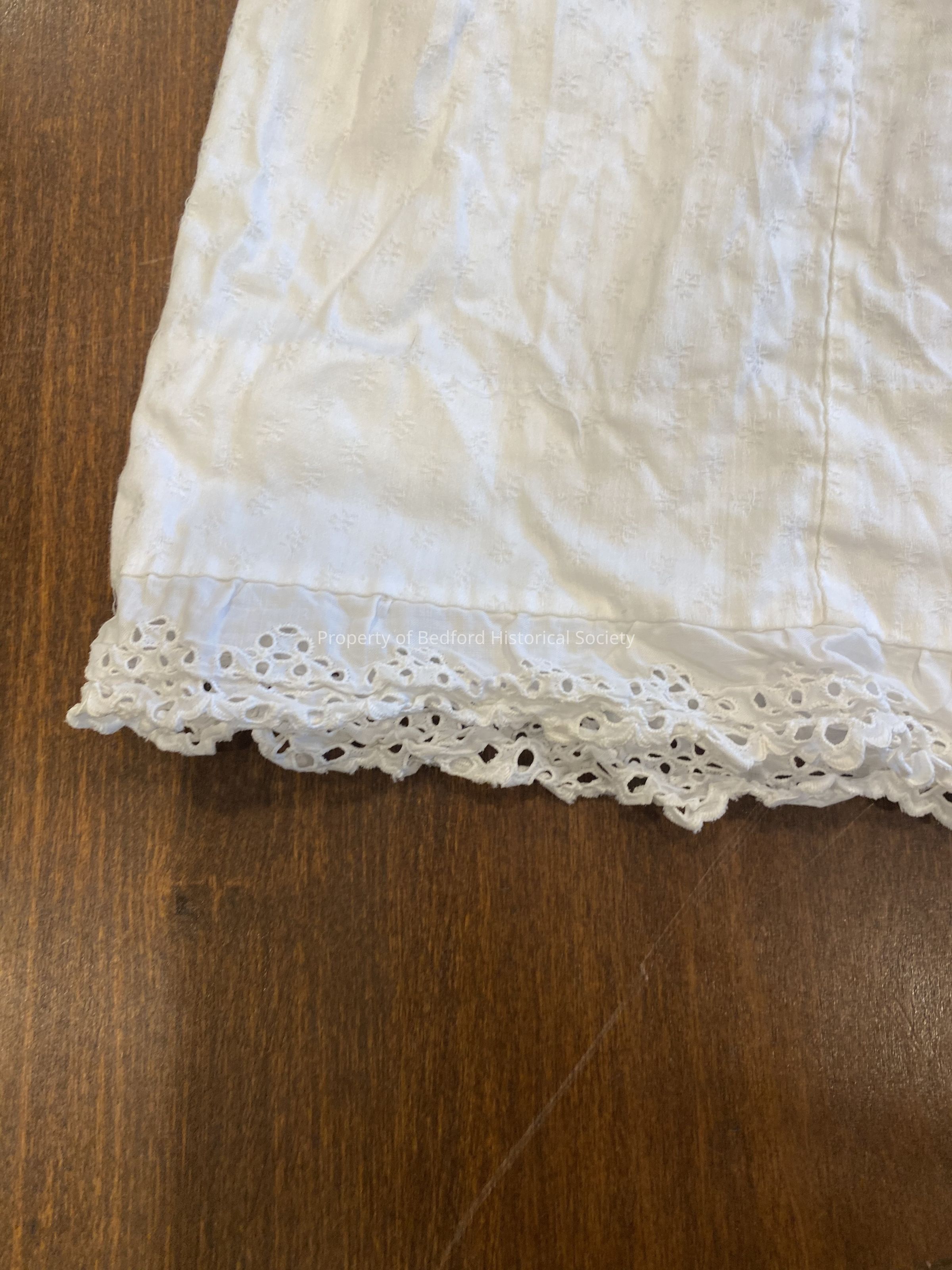 infants dress that wraps and closes in back with broderie anglaise trim, shoulder straps connected with buttons, bottom trim of broderie anglaise