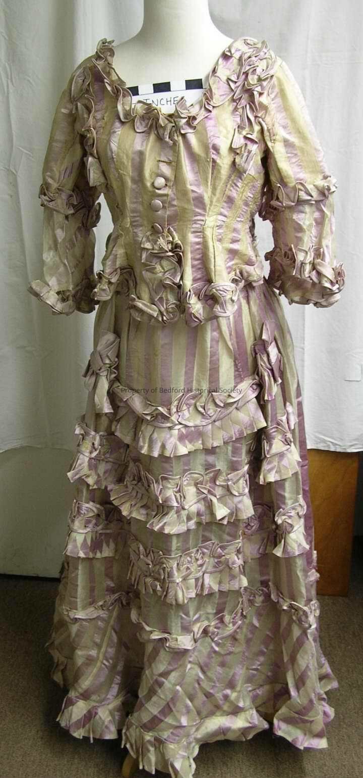 Two-piece afternoon dress, circa 1905, of silk woven with a lavender and ivory ribbon stripe trimmed around the scoop neckline with self ruffles.