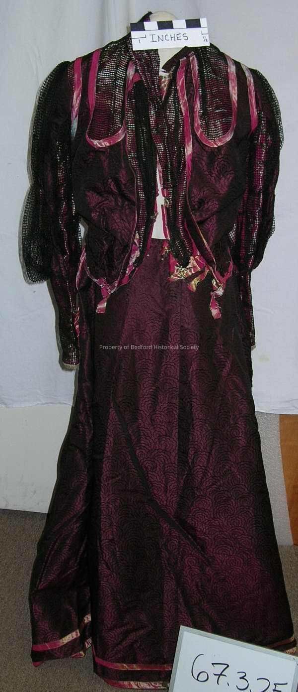 Two piece formal day dress, turn of the century, iridescent fuchsia/lime green silk woven with a random design of streaks, (disintegrating in a way consistent with the arrangement of the pattern), alternating with fuchsia/black patterned silk woven with a chrysanthemum petal design, the Tudor style sleeves with large puffs and long cuffs overlaid with black mesh; the long flared skirt of the petal fabric, overall condition good, except for splitting fabric in bodice, label: Mme. L. Schober Robes 668 Main St. East Orange New Jersey.