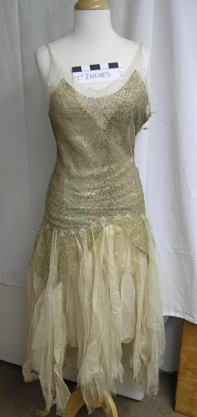 Evening Dress, circa 1925-26, possibly after Chanel, the chemise body of the dress of silver lace set at the low waist with handkerchief panels of cream silk tulle, lined with cloth of silver, two underskirts finished with picot stitching, good condition, some fragility