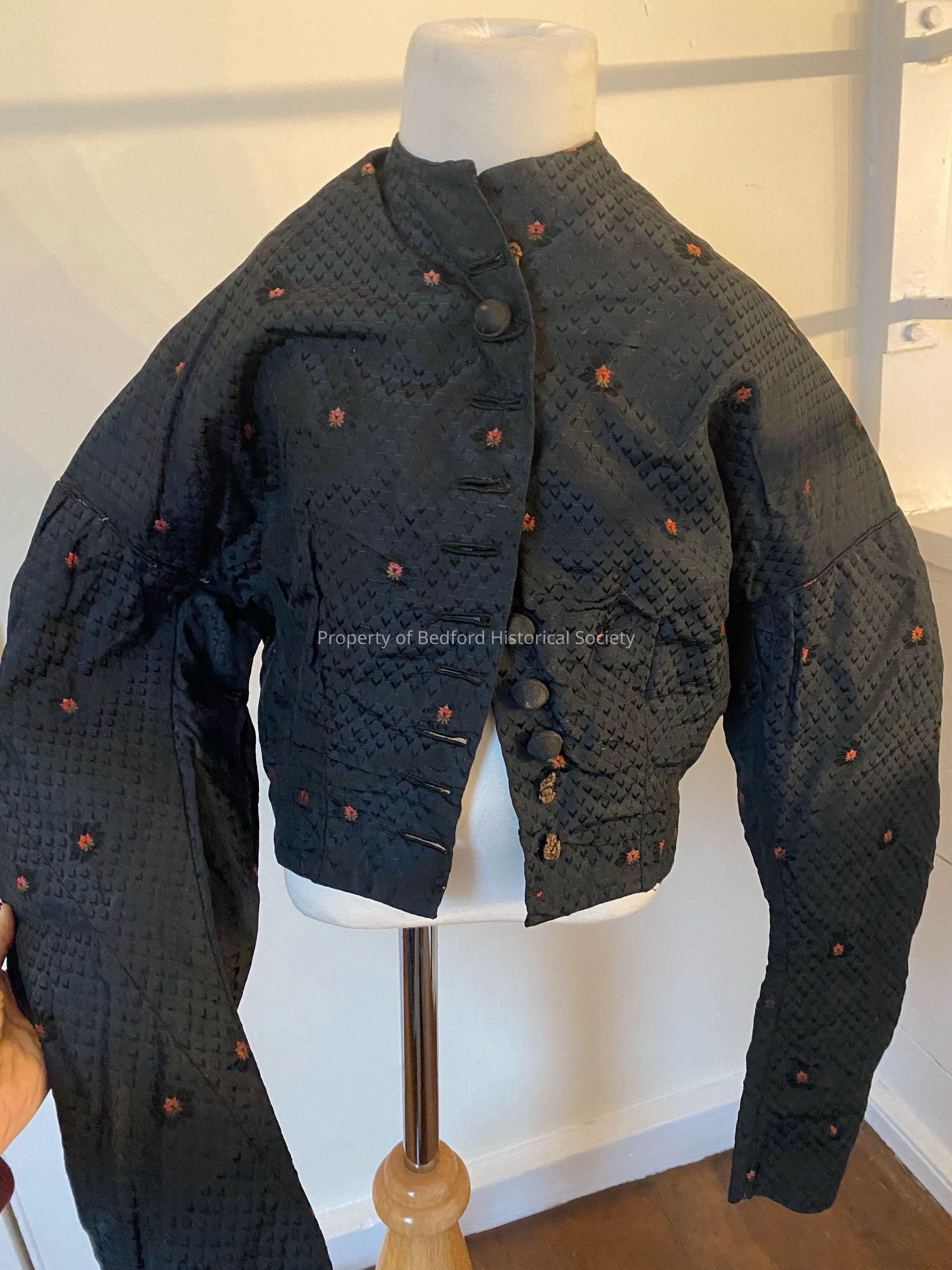two piece black silk dress with pink embroidered flowers, possibly made for a child. The dress has a skirt and three different bodices: two for day (one with fringe) and one for evening. The ensemble also has a longer bodice/jacket. Comes with two finished shawls and a belt with braiding and rosette.