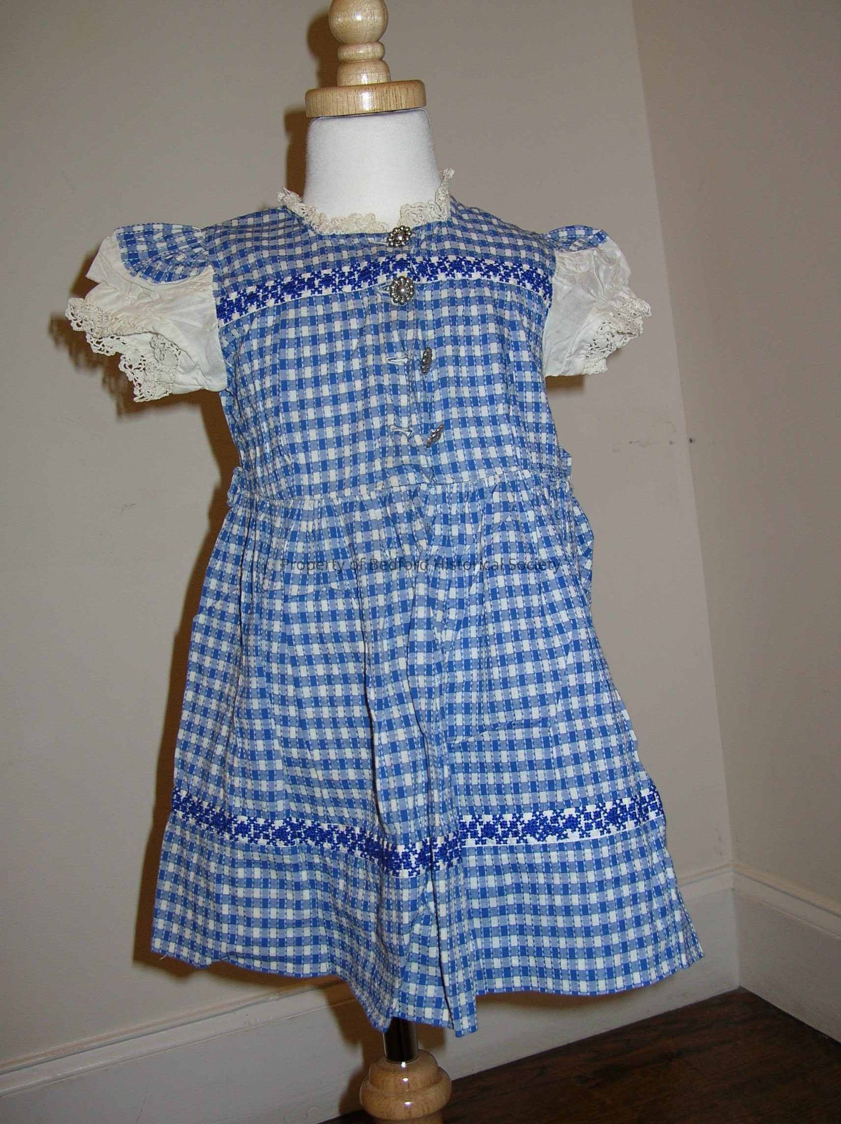 two shaded blue and white checkered children's cotton dress with white eyelet collar, having darker blue patterned desing along band of bodice and skirt, and four silver buttons in the shape of flowers. Tag reads "Lord and Taylor Fifth Avenue". Belonged to Steffie or Annie.