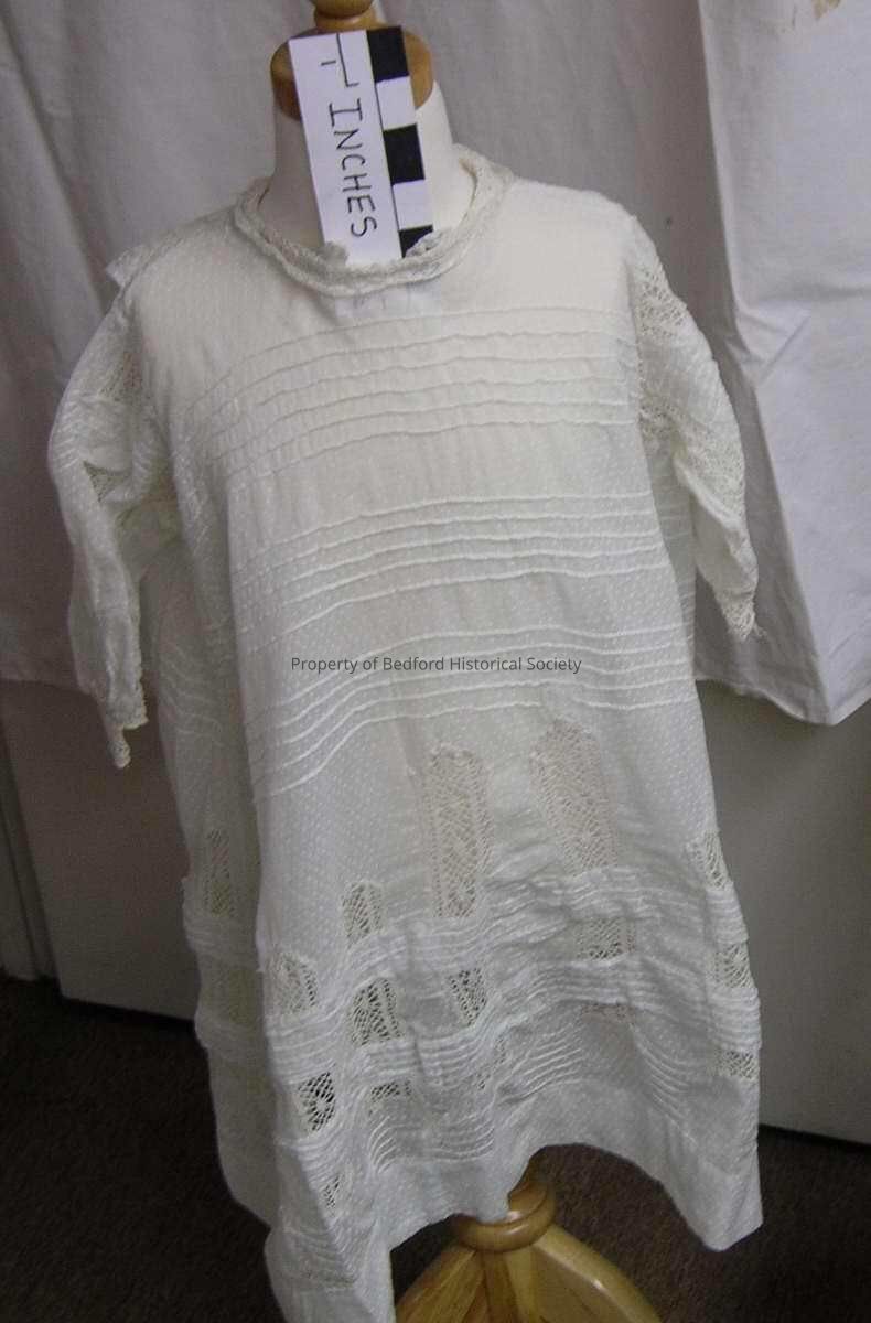 Dotted Swiss child's dress, 1880s, originally pale blue, made with rows of hand pin tucks alternating with bands of lace insert, made as one of the wide dresses that flared out from the neck, areas of discoloration
