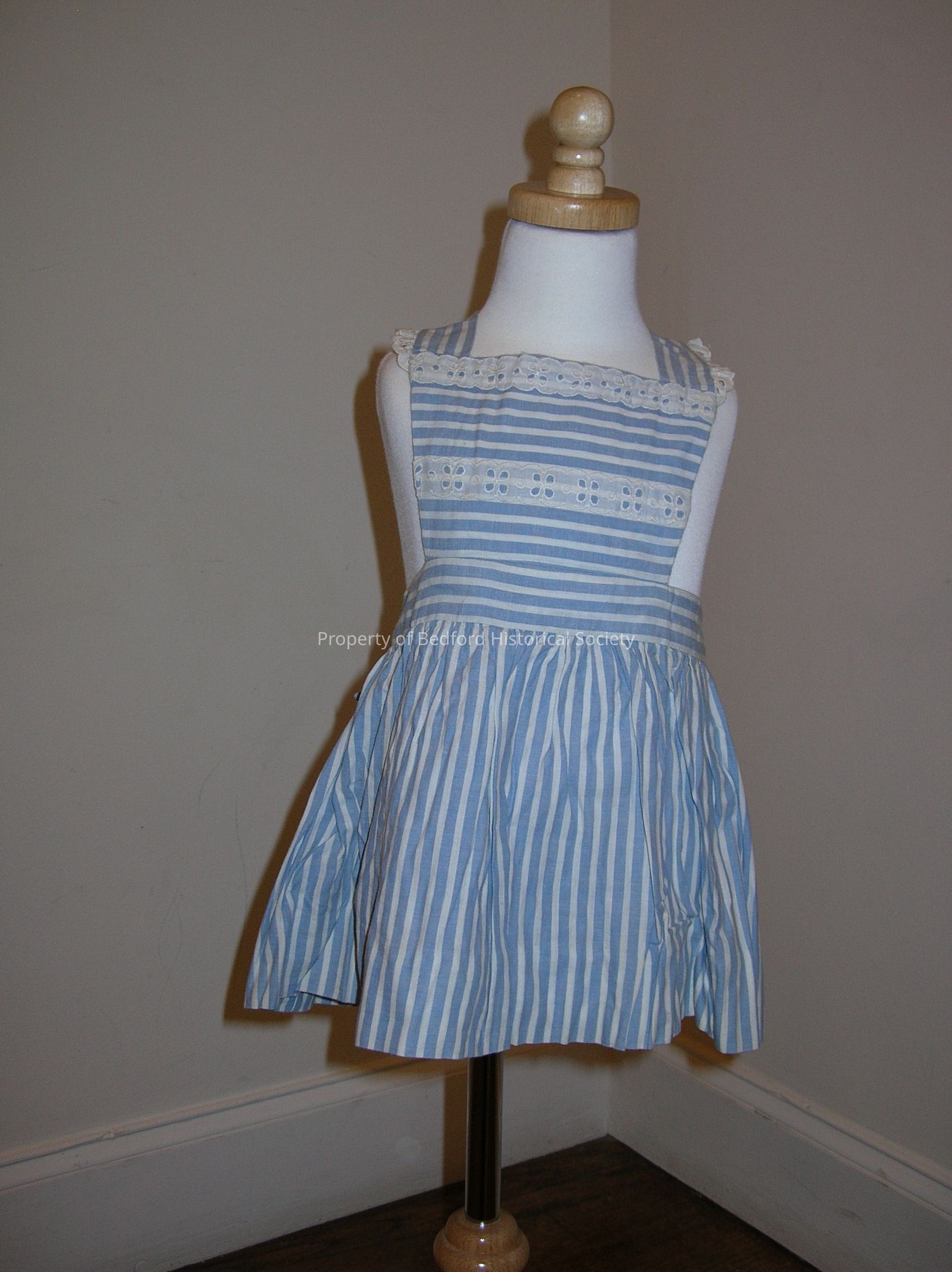 light blue and white striped child's gingham pinafore dress. Belonged to Steffie or Annie.