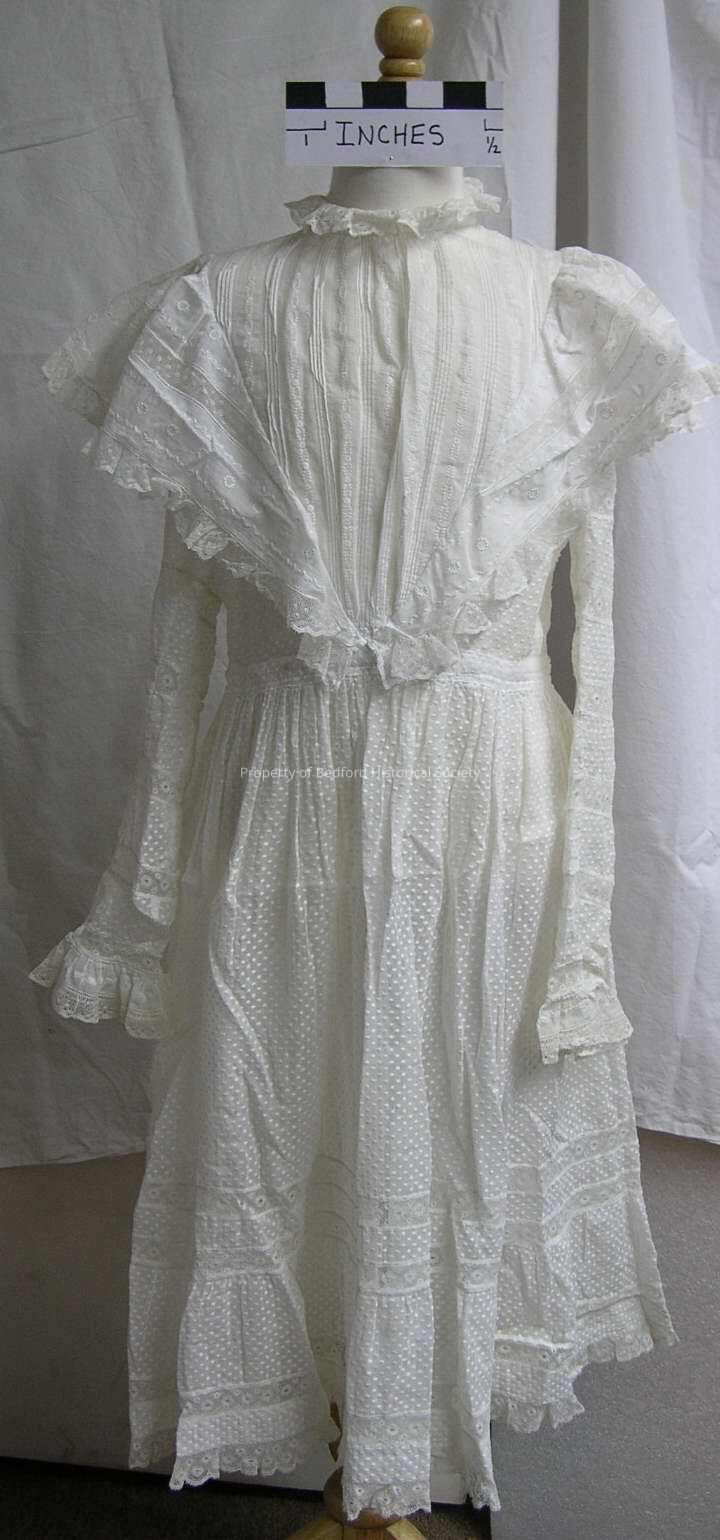 Girl's lingerie dress, turn of the century, dotted swiss inset with bands of handmade Valenciennes, the bodice with ruffled lace collar above V shaped insert of bands of broderie anglaise alternating with bands of pin tucking, then wide panels arranged in a V meeting at the waist and continuing over the shoulder forming cap or cape sleeves over long narrow sleeves, very good condition. Note: would have been worn with black stockings and shoes.