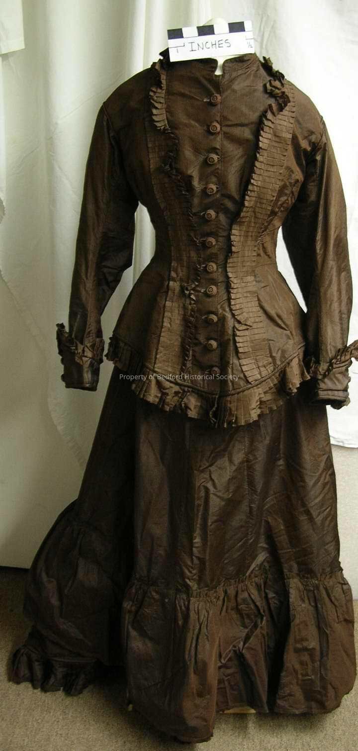 Two piece formal day dress, note attached to skirt stating it was worn by Eliza Margaret O'Conor Sloane, Bustles and Bloomers exhibit catalogue lists donor as "Bedell" and apparaisal listing states "associated with Mrs. E.A.P. Jackson. Late 1870s, brown/black pinstripe silk taffeta, long basque bodice trimmed with flate pleated ruffles of brown taffeta, brown crocheted covered buttons, very good condition except for splits to fabric.