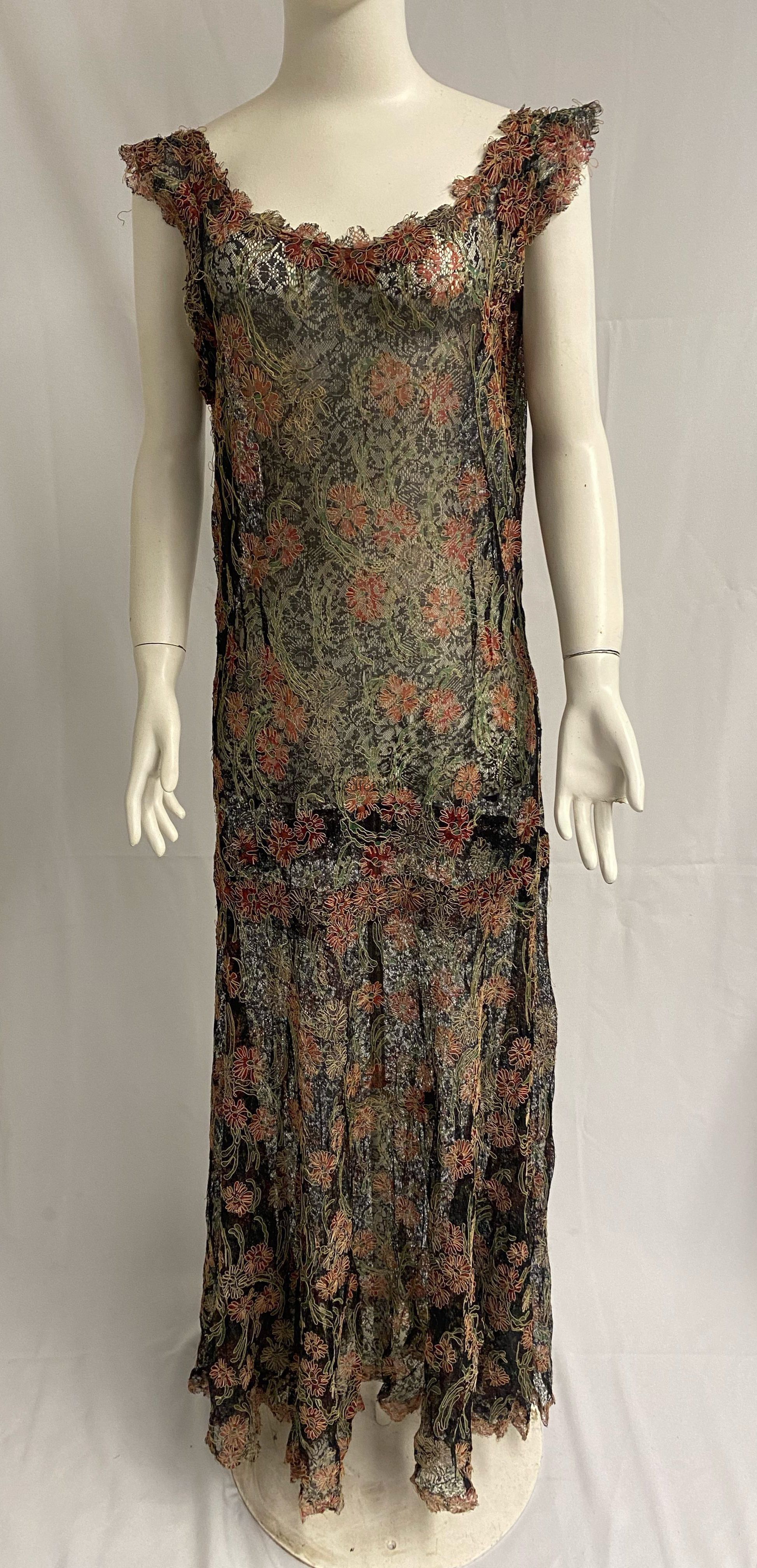Chanel-style floral lace in black with red and blue flowers, green leaves, and thin beige cordonnet outlining.
