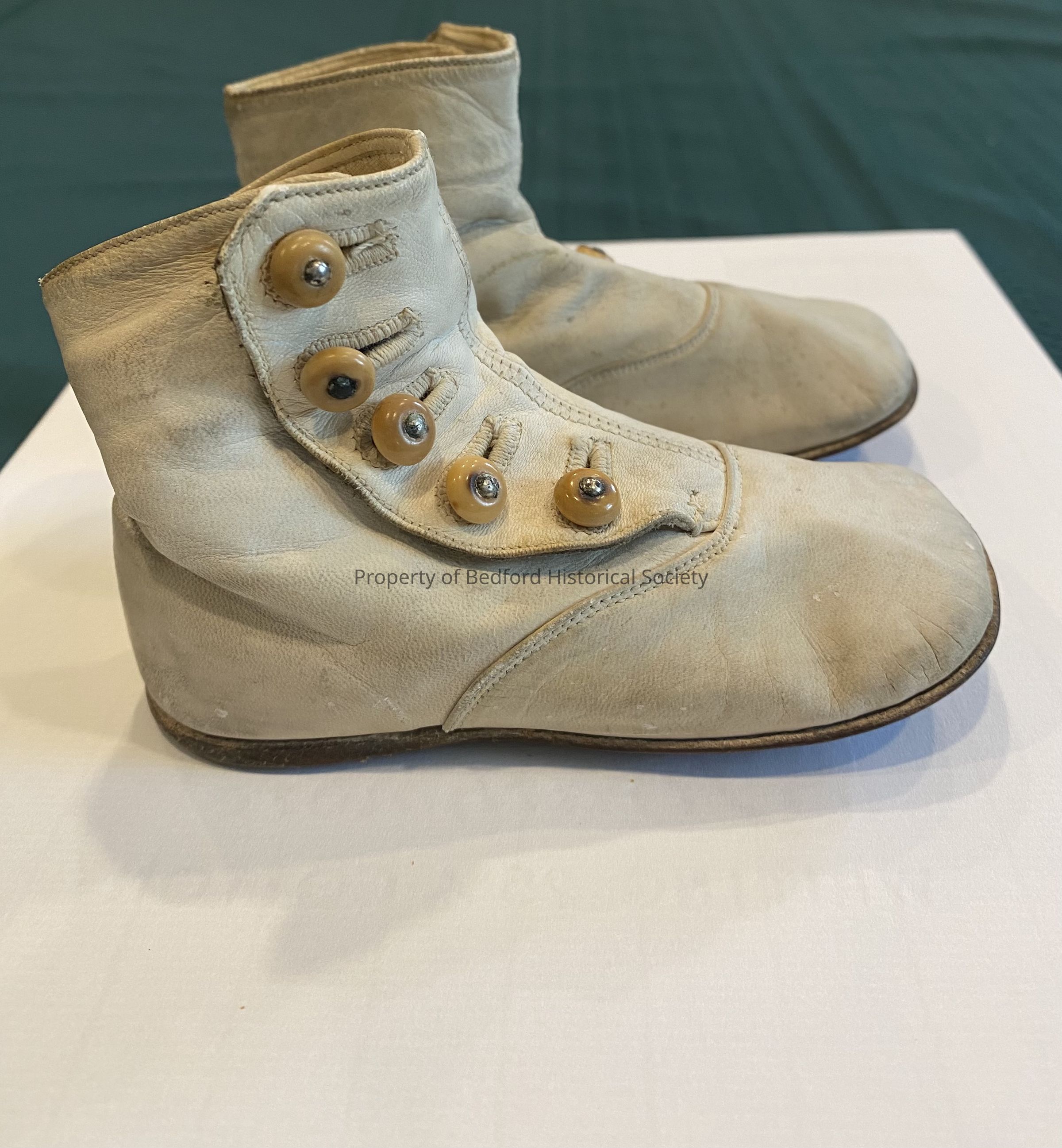 Side button white leather baby shoes 5" long, 3" high