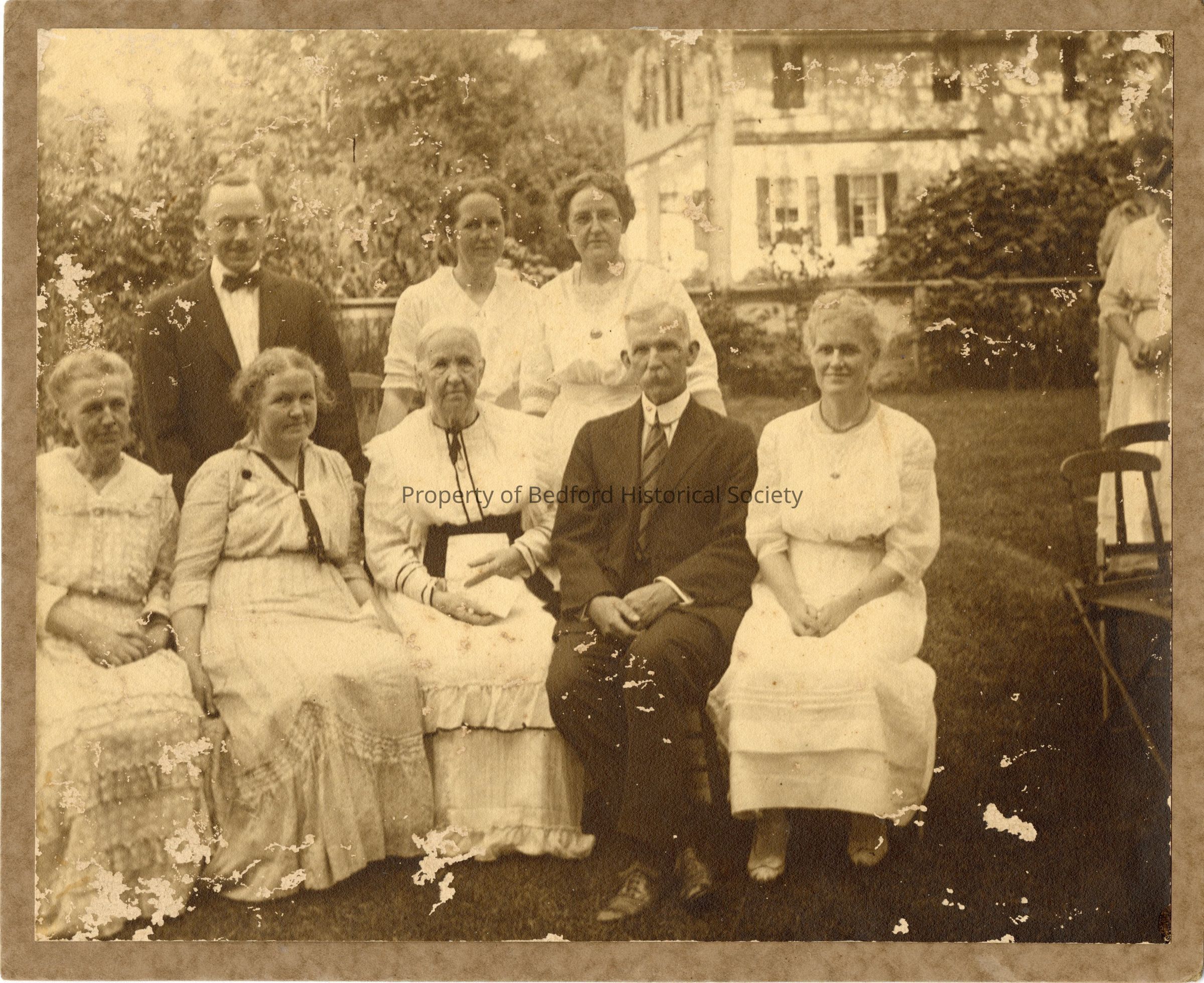 B + W large format photograph of Hope Bedell's family, (maybe mother's side?) of five people sitting, three standing, woman on far right identified as Phoebe Williams, Hope Bedell's mother. (on post it attached to photo) Middle woman in white, third from left is Mary Minerva (Stone) Williams, Phoebe's mother