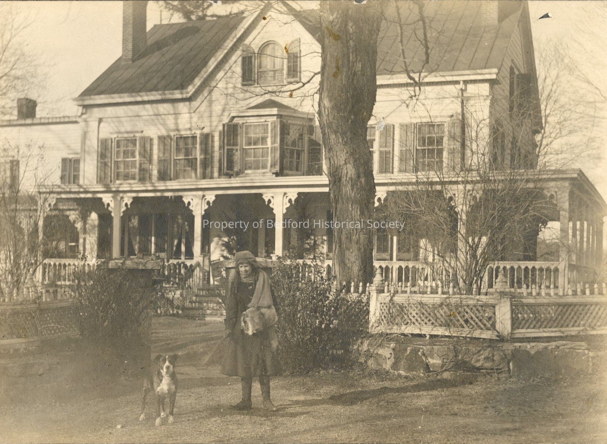 Mounted b + w photo of Hope Bedell? in scarf and jacket with dog in front of Bedell House.