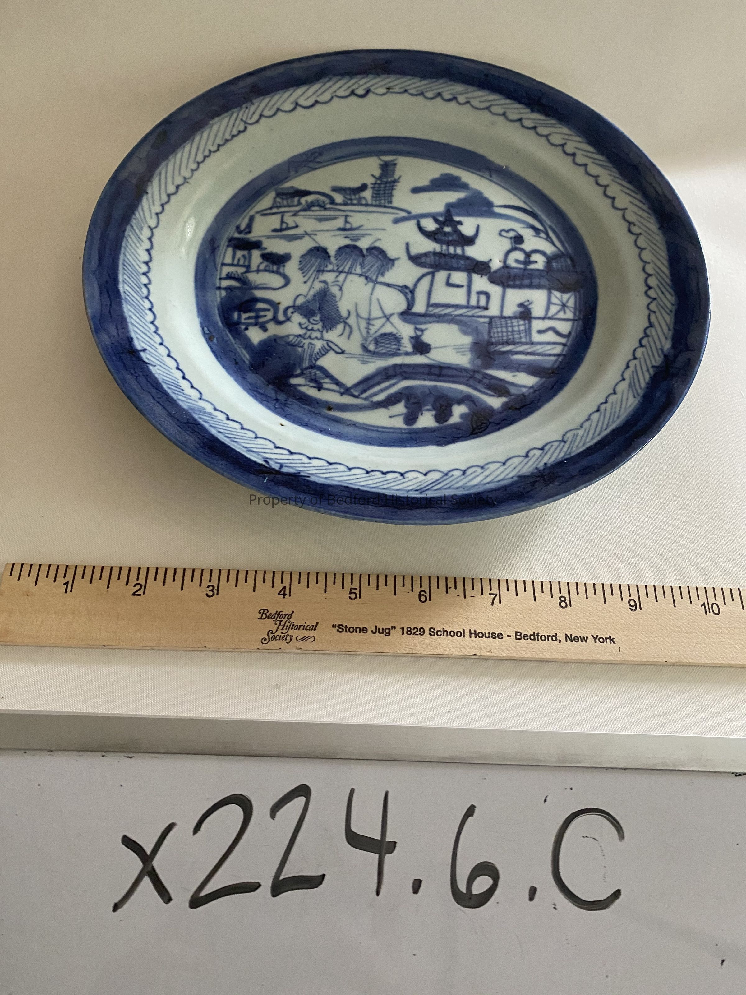 10 1/4" Dinner Plate; a blue lattice network and inner border of wavy or scalloped lines called “clouds” which distingues it as Canton China.