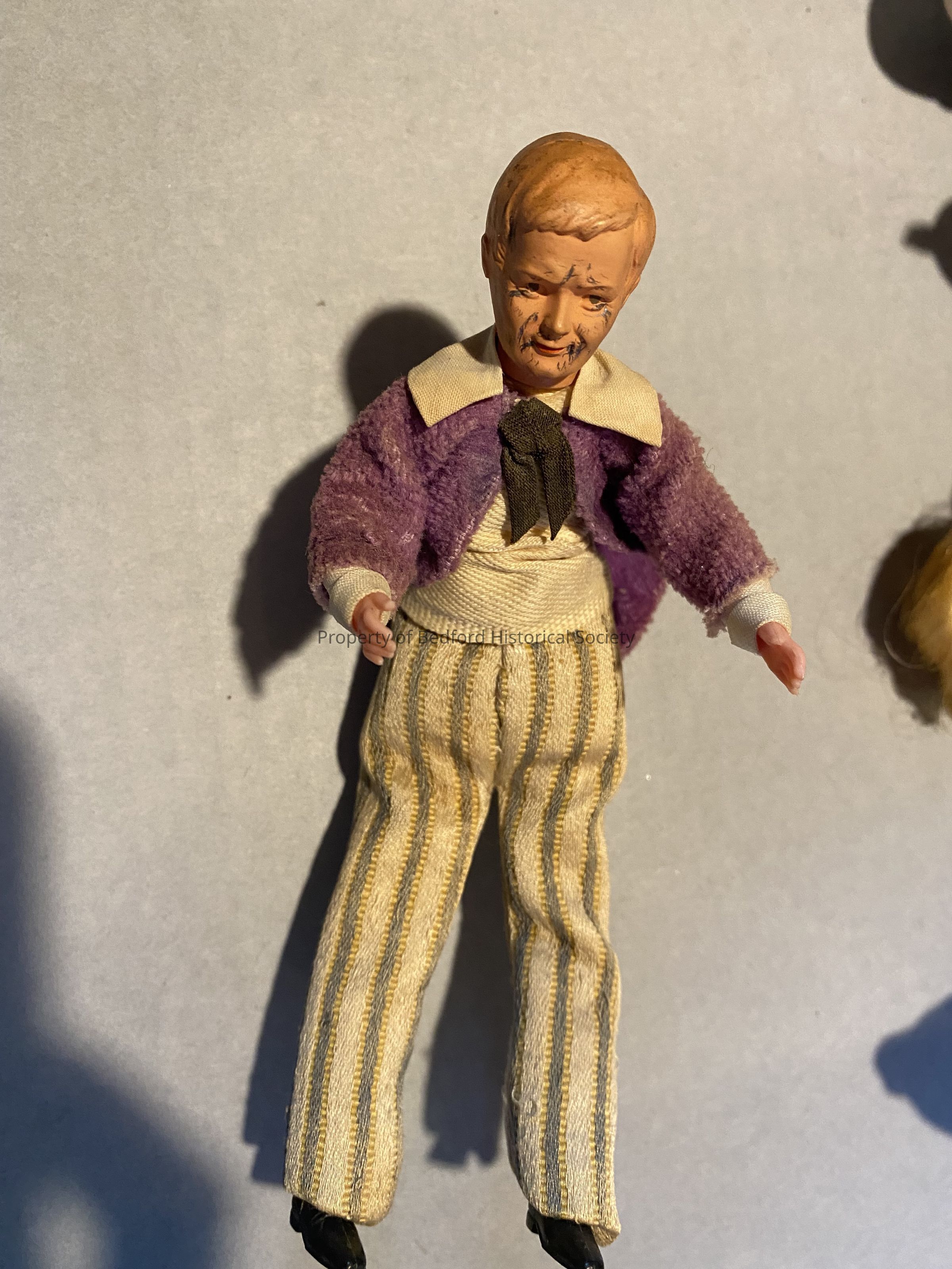 Doll of man with purple felt coat, beige shirt, and stripred pants *needs more research