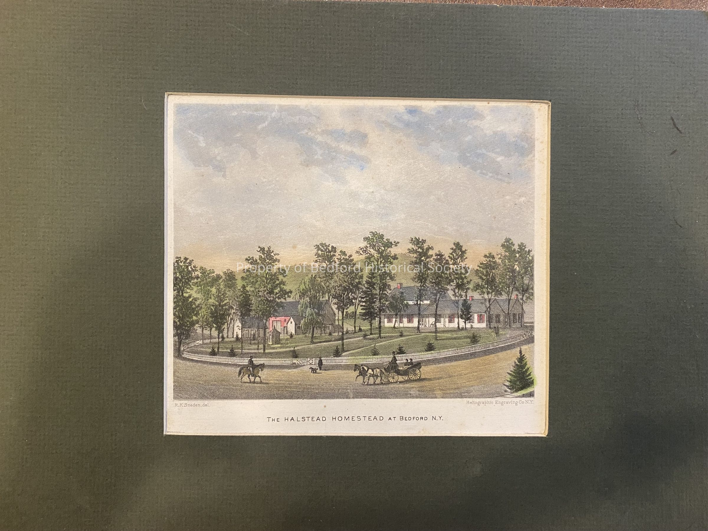 Hand tinted heliographic engraving of The Halstead Homestead at Bedford New York by Robert Knox Sneden This and other scenes of Westchester/Putnam Counties were apparently commissioned by the publishers of F.W. Beers' county atlases to be included in their 1867 atlas of local maps. *copies that are not acquisitioned (in plastic) were given by Susan West in 2024