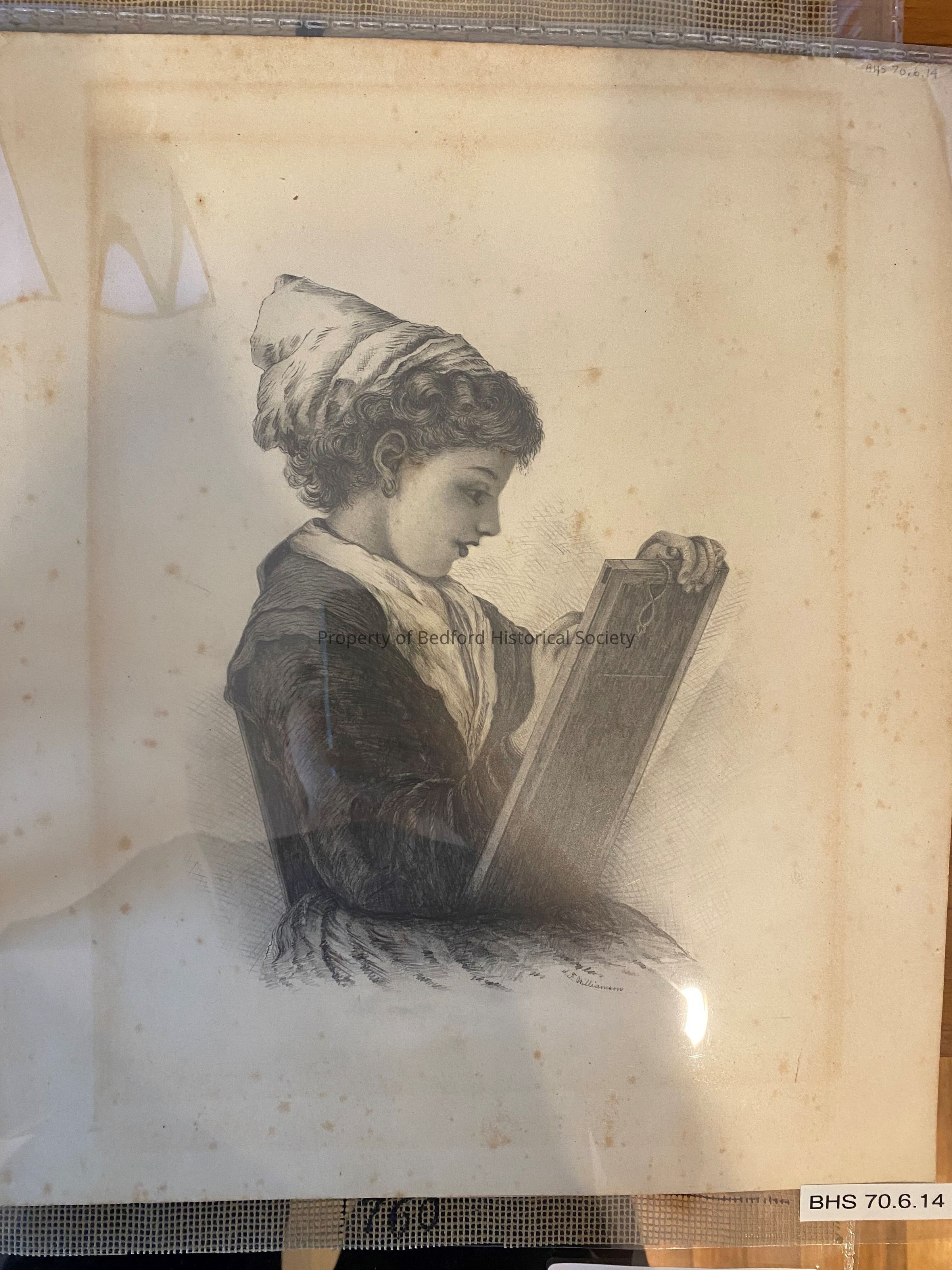engraving of young woman drawing with tiny inscription on bottom right of skirt J.F. Williamson