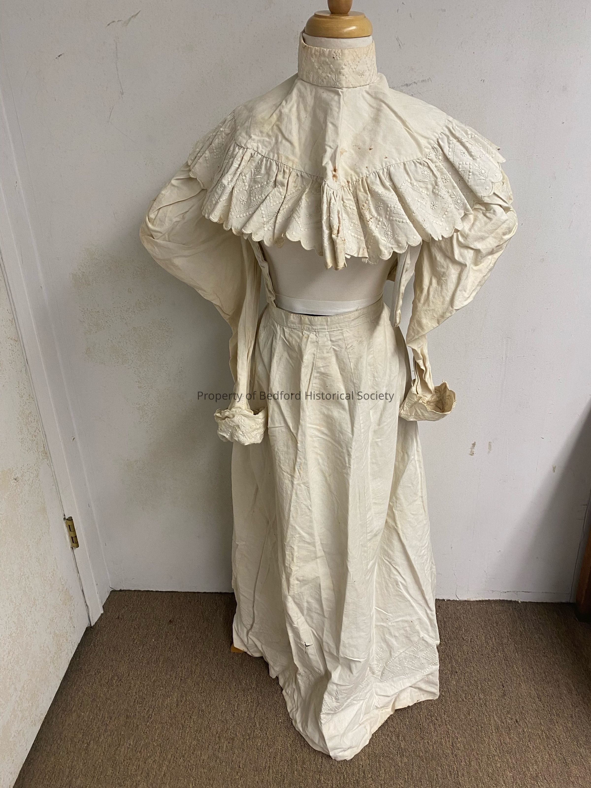 white embroidered ensemble with gigot or Leg O' mutton sleeves, matching collar, and skirt