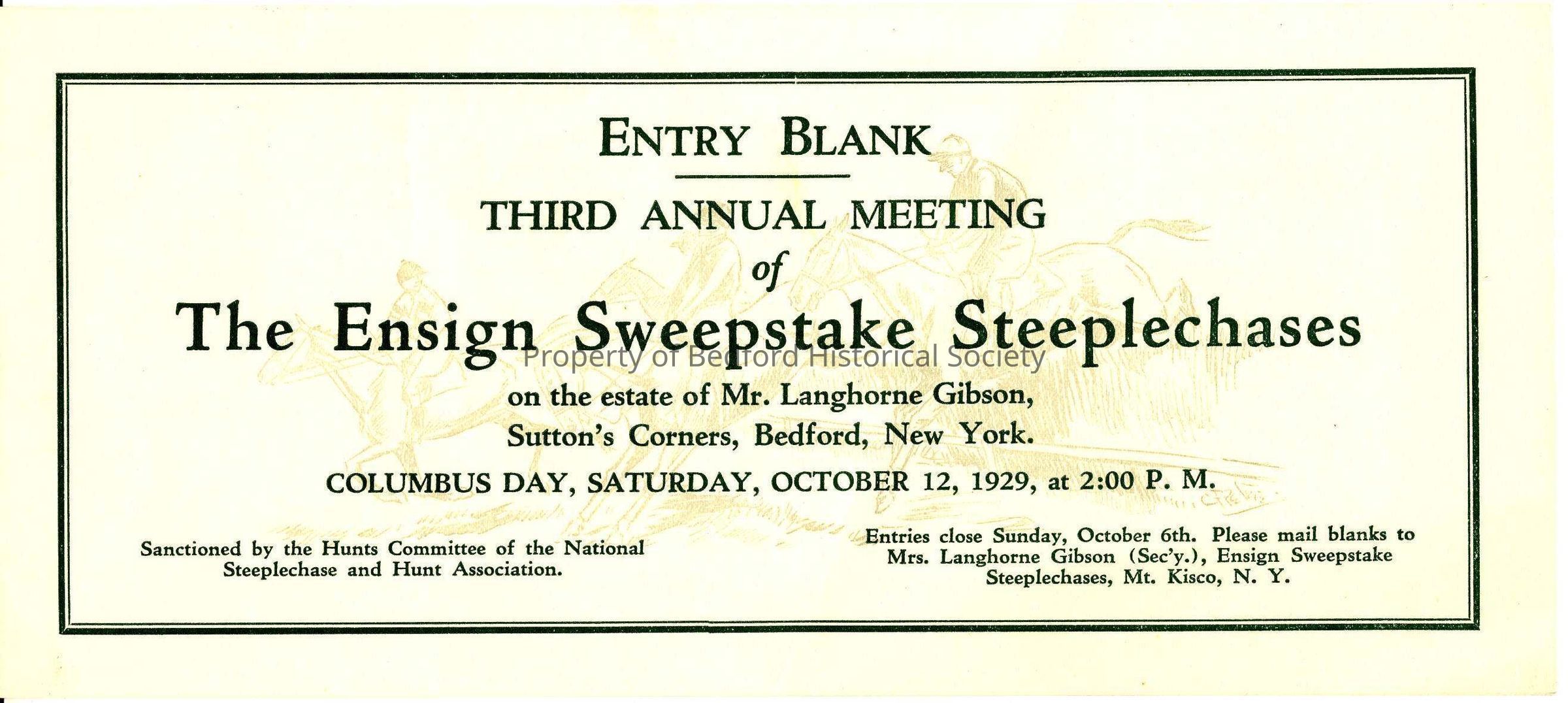 Entry Blank for the Third Annual Meeting of The Ensign Sweepstake Steeplechases on the estate of Mr. Langhorne Gibson, 1929