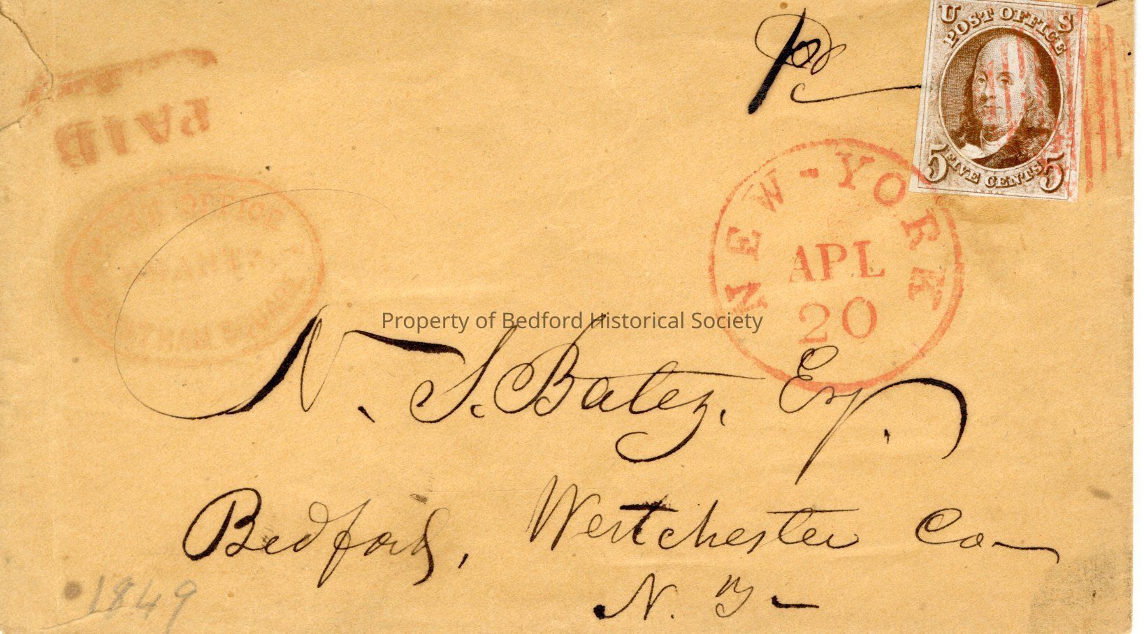 Beige envelope with handwritten address reading "N.S. Baley Esq./Bedford, Westchester Co/N.Y.", stamped New York April 20, with stamp of George Washington