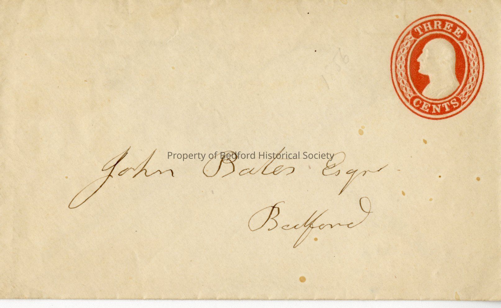White envelope addressed to "John Bates Esq./ Bedford with Red decorative silhouette seal featuring a side profile in white with Three Cents written around rim