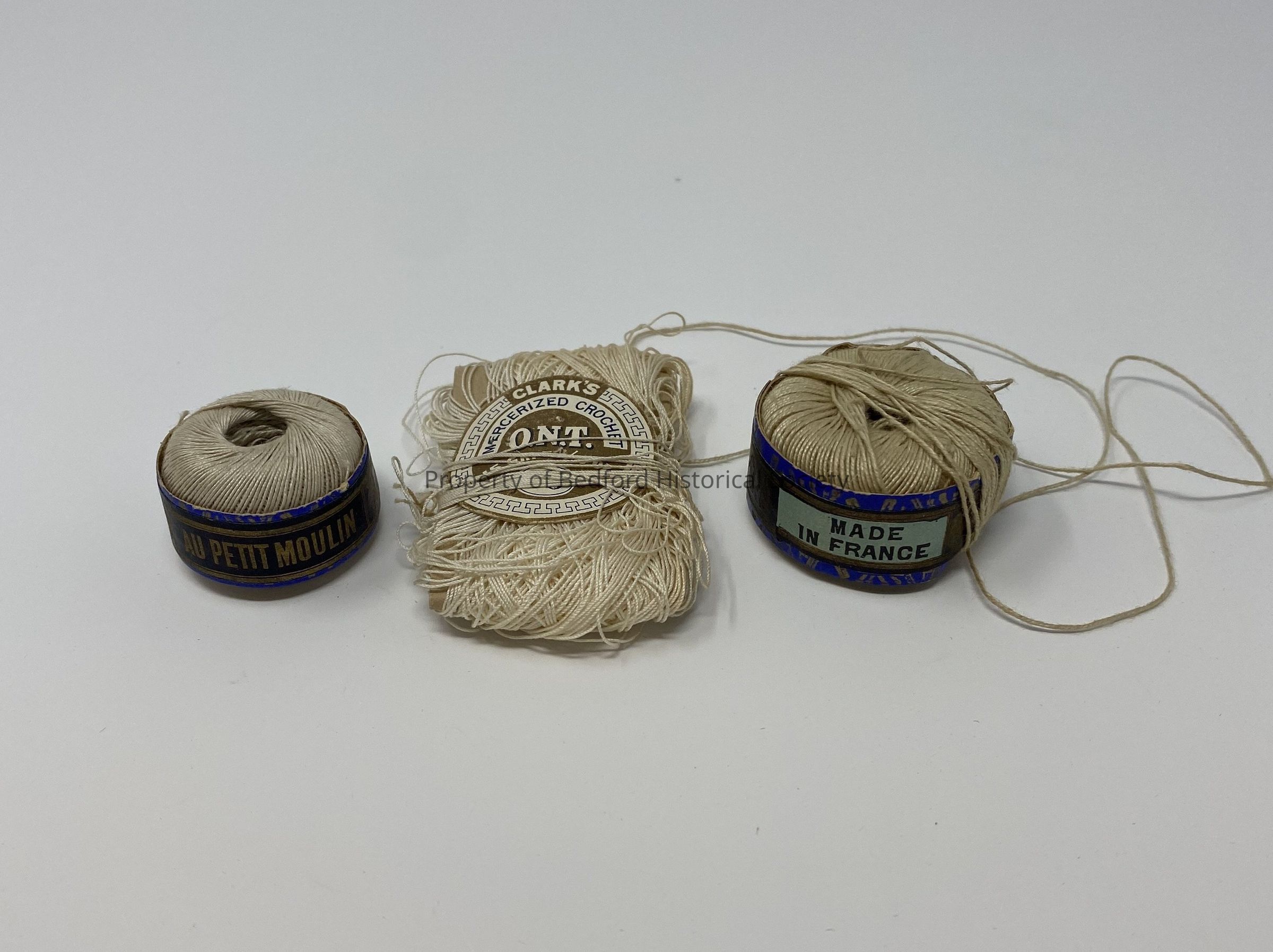 Three spools of linen thread in original packaging, first is 50 yards of Au Petit Moulin brand, second spool is Clark's Marecerized Crochet Ont., last is also Au Petit Moulin brand, but back says "Made in France".