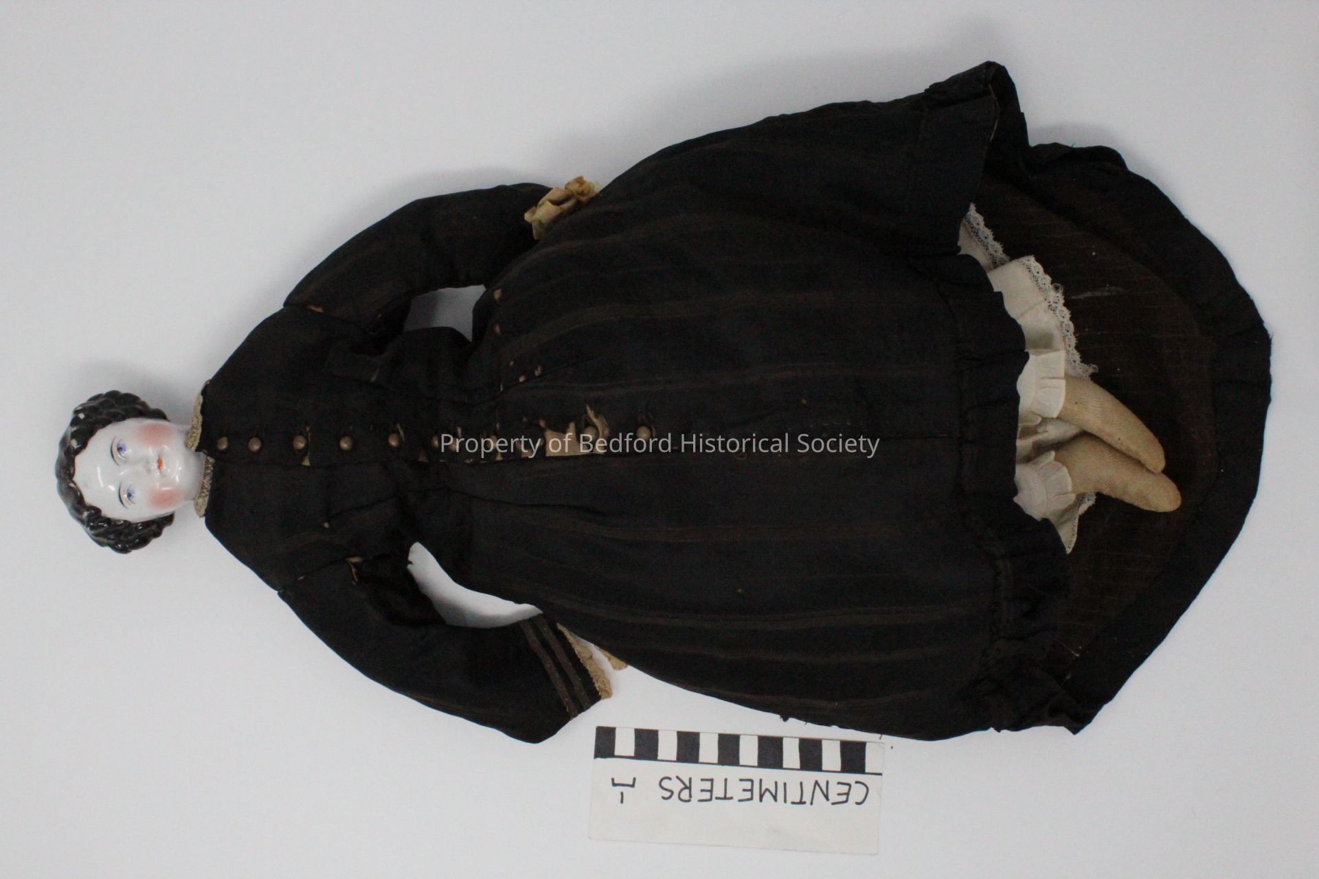 China head doll with "civil war" head, canvas or cotton arms and legs, having molded black painted hair, face and pink cheeks, black/brown striped long sleeved dress with buttons that extend up to neck, hem of skirt is shorter in front and longer in back, following the style of the mid-late 1860s fashion