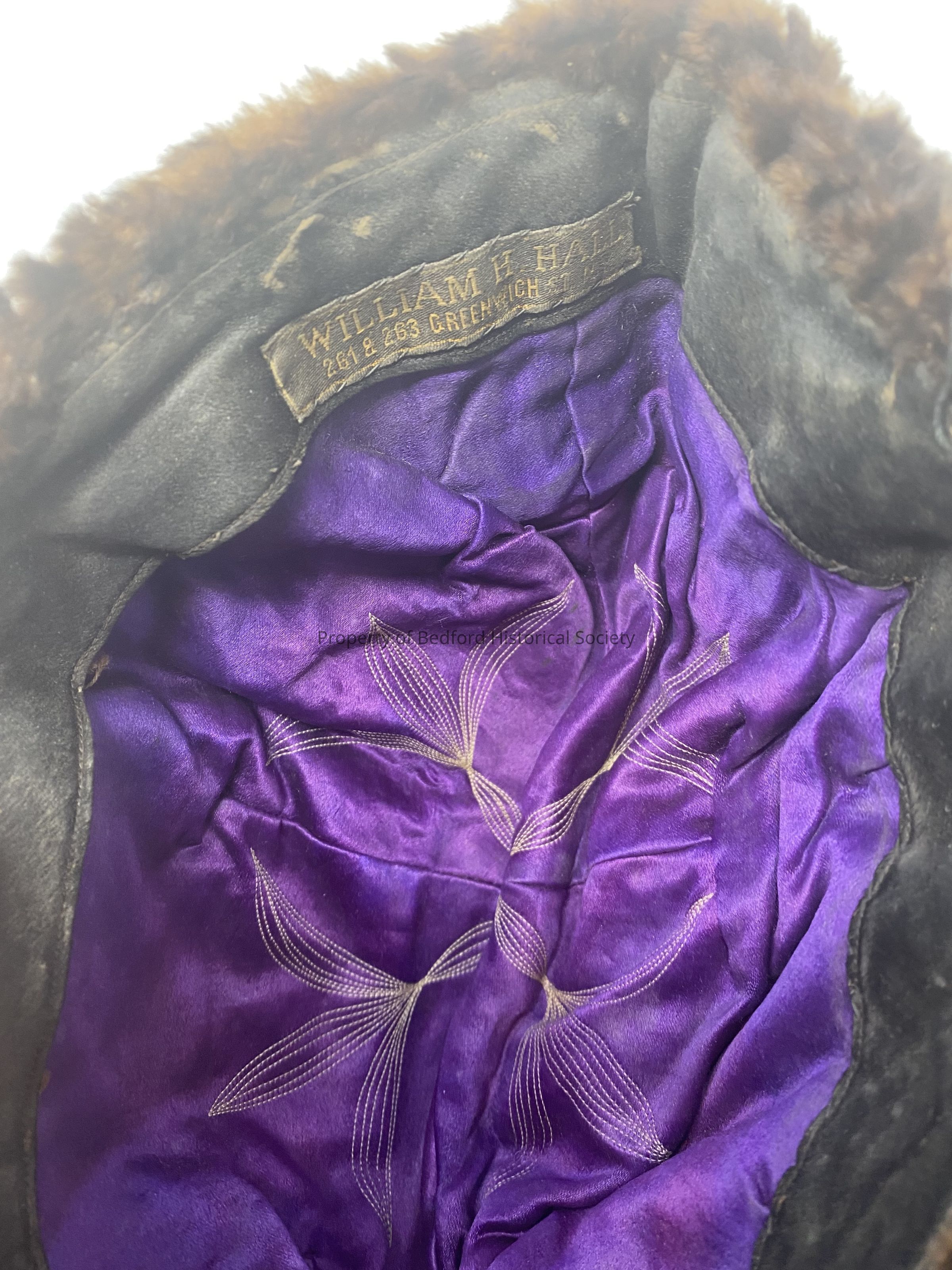 inside has purple lining with decorative white stitching and tag reading: "William H. Hall 251 & 263 Greenwich Street, N.Y.