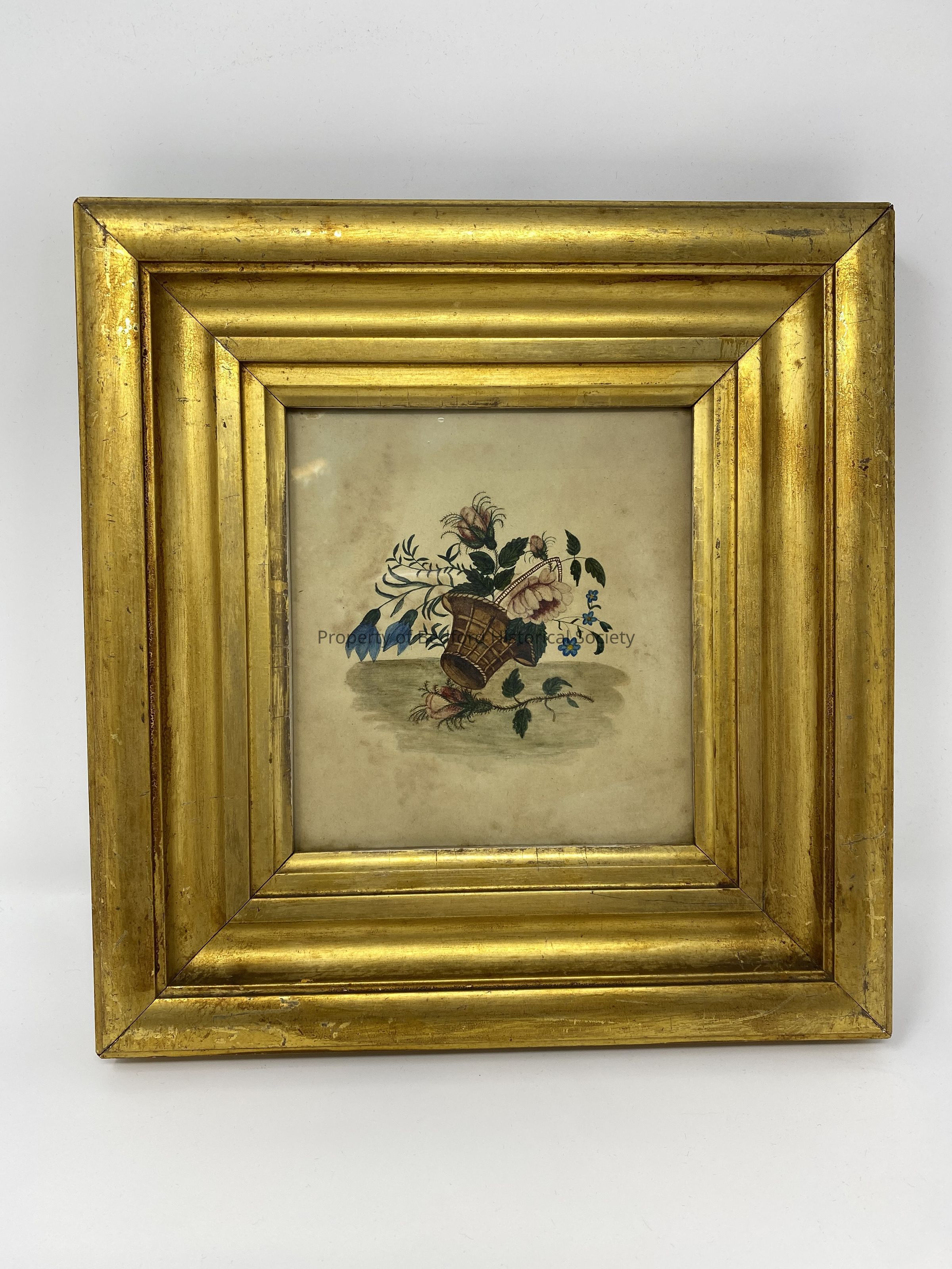colored illustration of flowers in basket, framed in gold gilt frame 11" L by 10 7/16" W