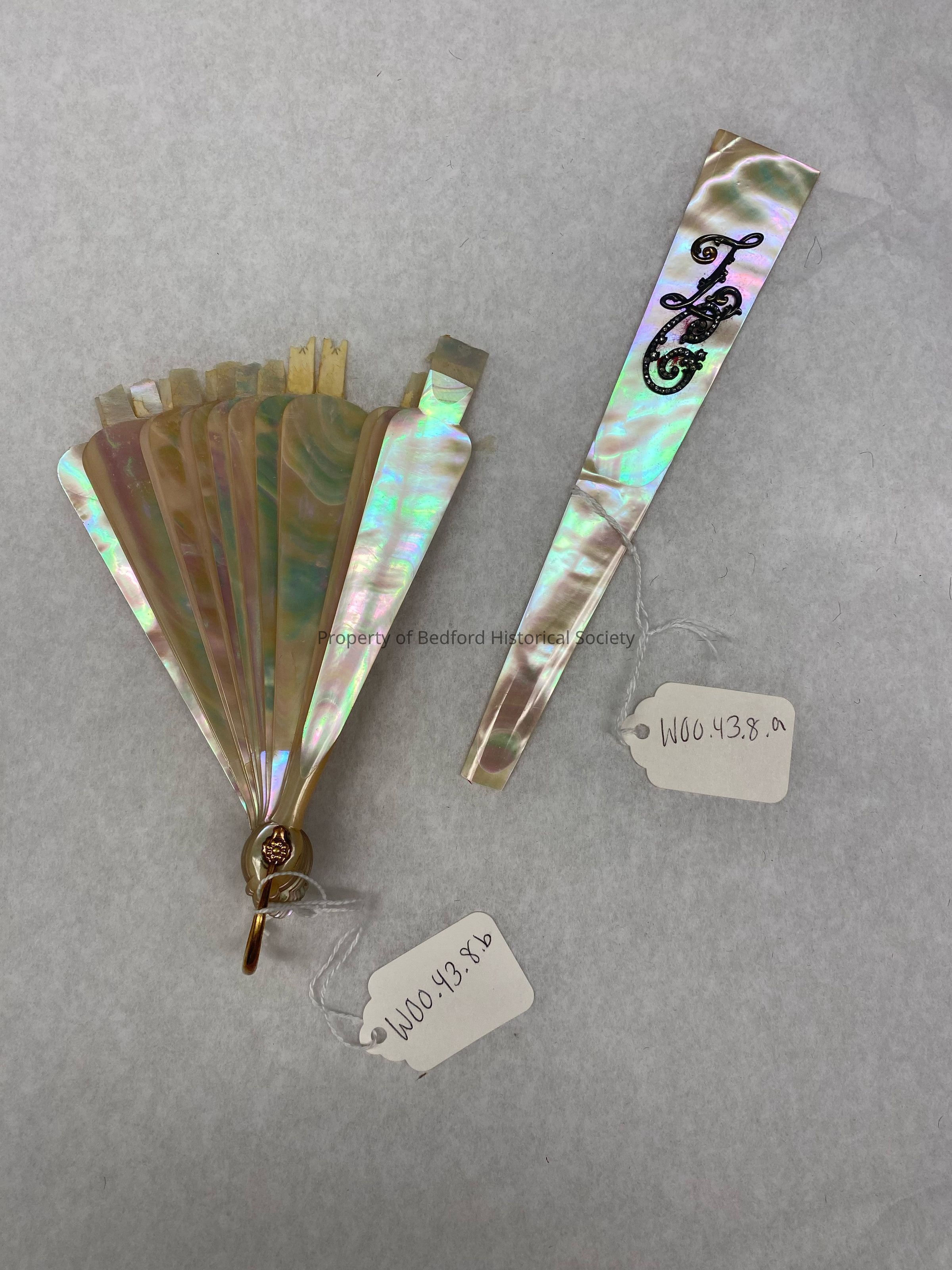 Mother of pearl iridescent fan with metal decorative initial either LC or LG. Broken in pieces