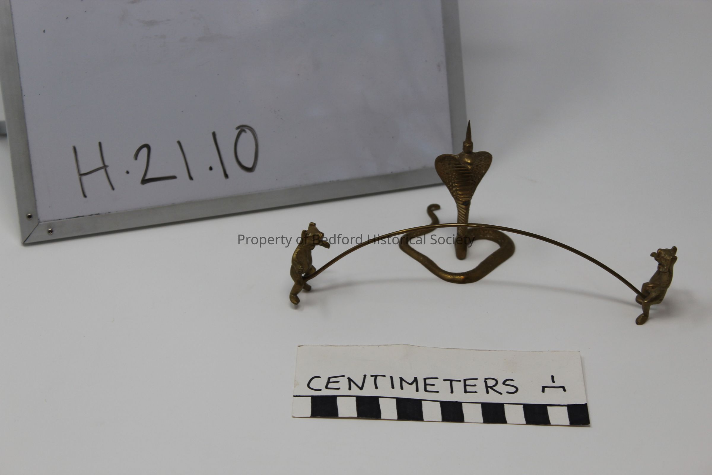 metal figure of cobra with sharp point on head, two bear-like figures on each end of bend metal wire. bear? figure on wire: 7 3/4" L cobra figure: 3.5" H