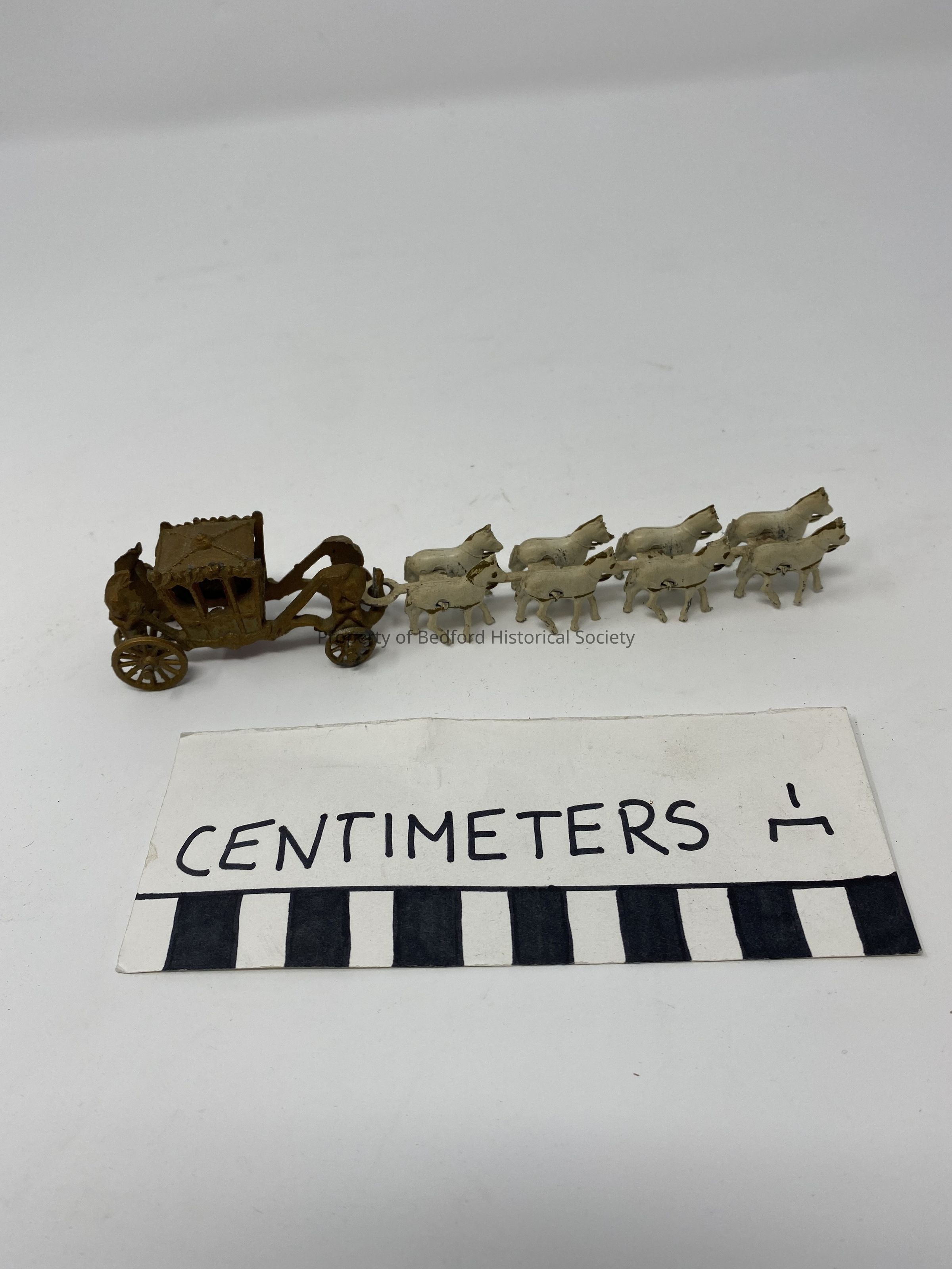 Figure B: silver carraige with 8 horses, four have jockeys in red coats, mount in between horses reads "made in England", 4.5" L