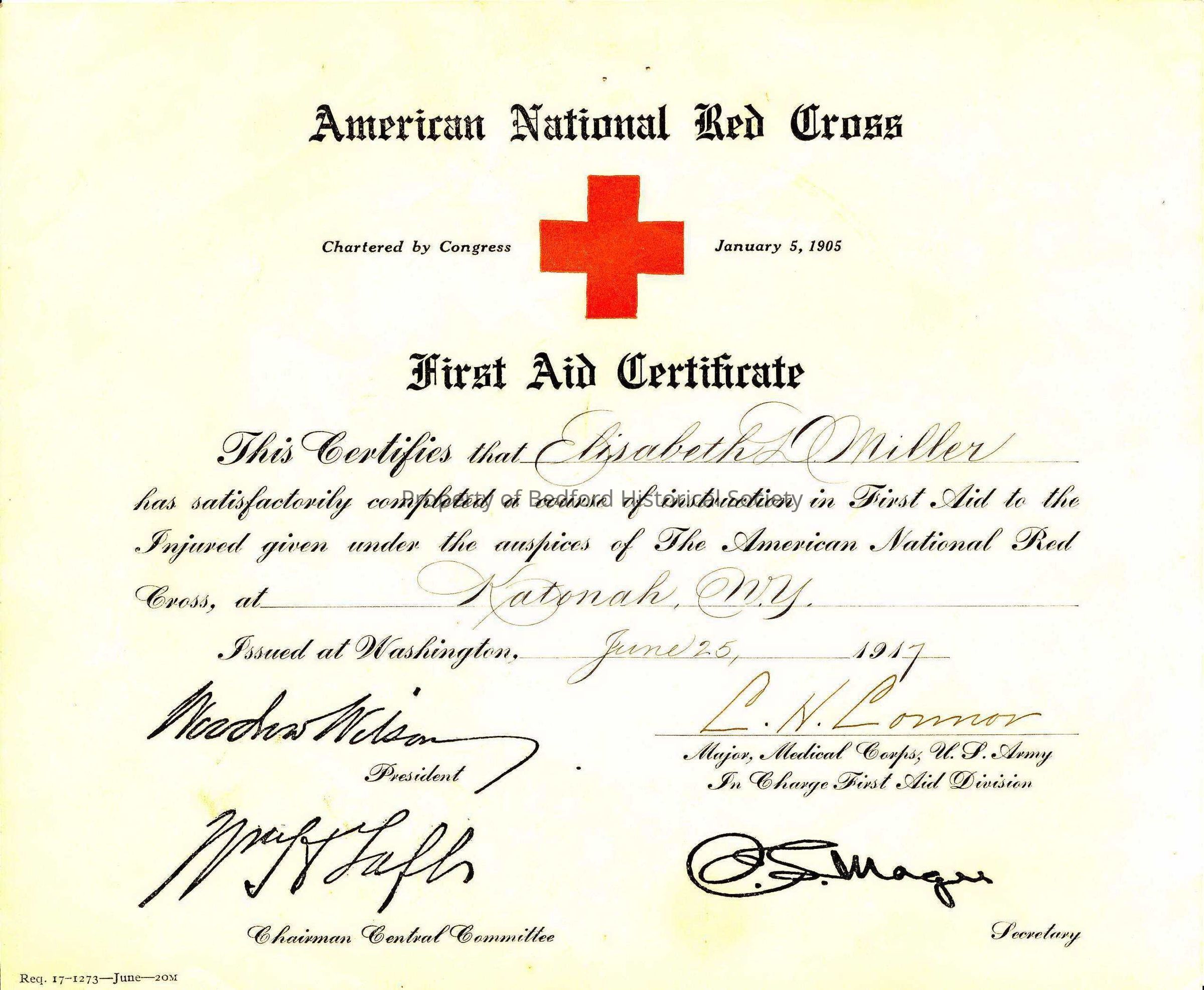 First Aid Certificate for Elizabeth D. Miller from the American National Red Cross, 1917