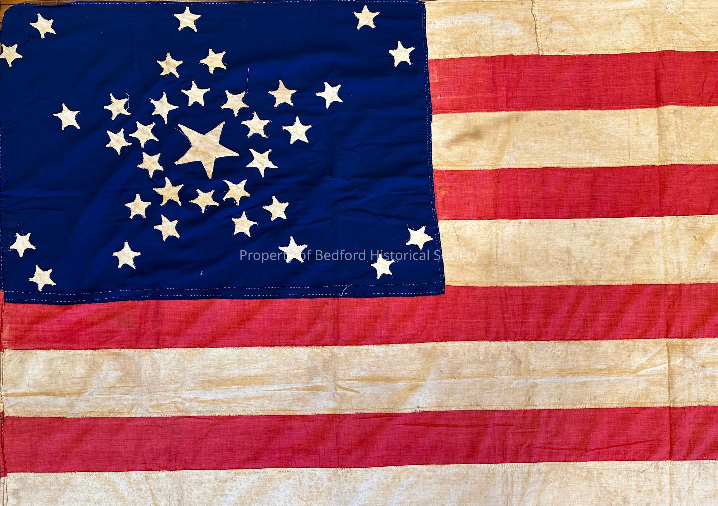 33 star cotton flag for when Oregon was added to Union, circa 1859. Hand-sewn, double appliqued cotton stars in 'star' pattern, wool bunting canton, hand-sewn stripes, linen
