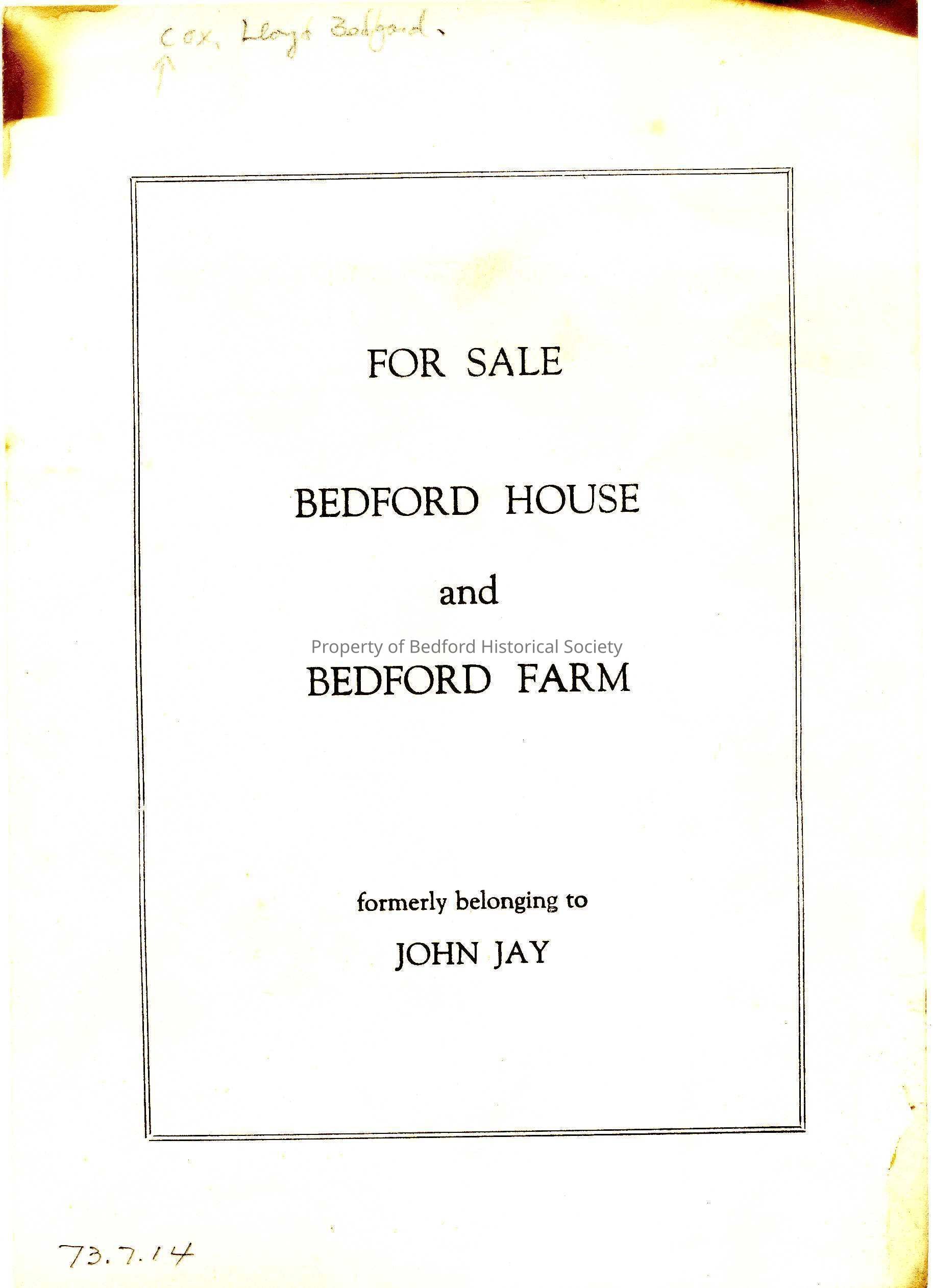 For Sale notice of Bedford House and Bedford Farm formerly belonging to John Jay, ca 1953