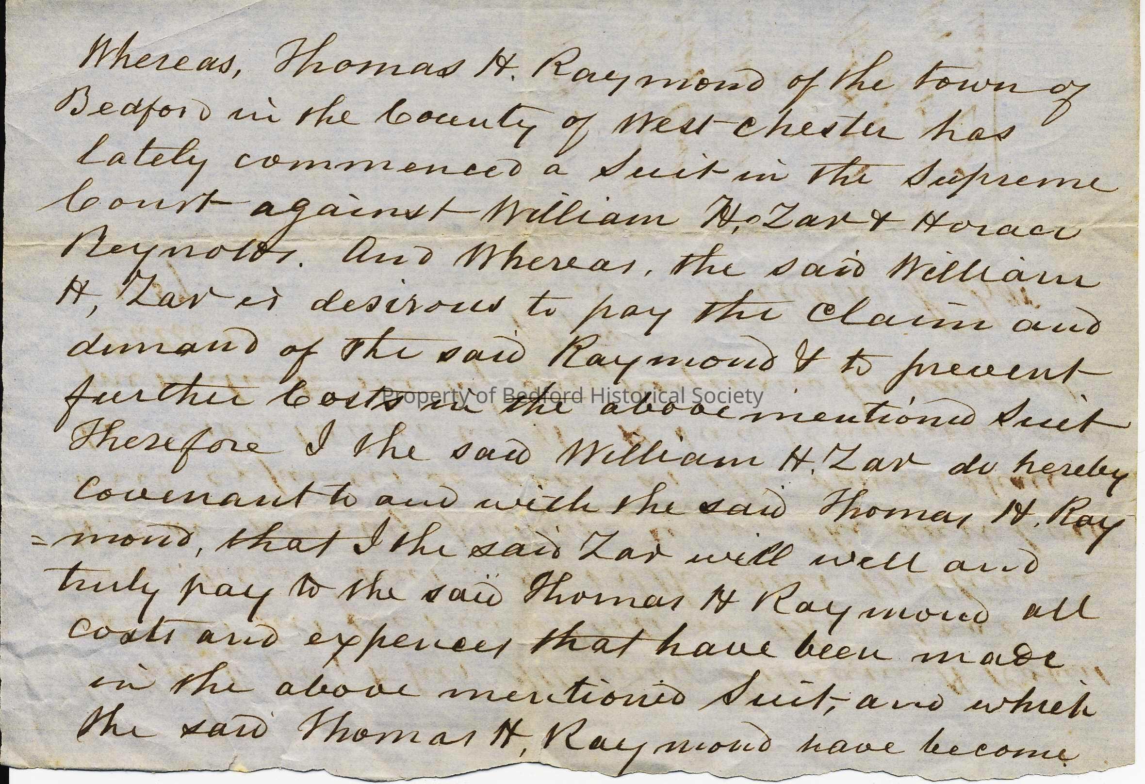 1. Settlement of suit between Thomas H. Raymond and William H. Zar and Horace Reynolds (in W.H. Robertson's handwriting) 1857