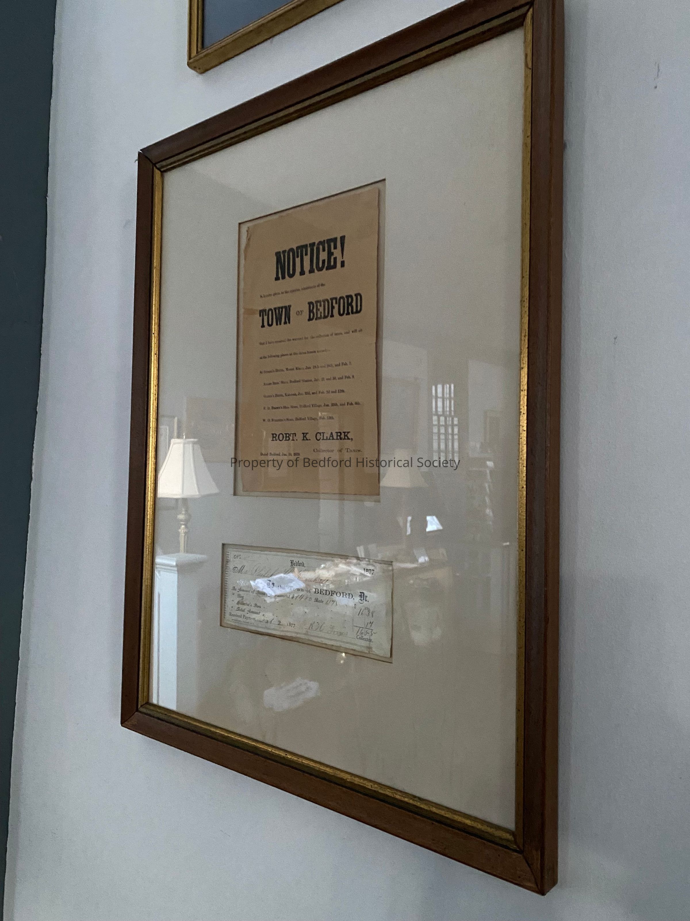 Framed notice regarding taxes from Robert K. Clark, Collector of Taxes dated, June 14, 1878/ Check made out to the town of Bedford dated 1877
