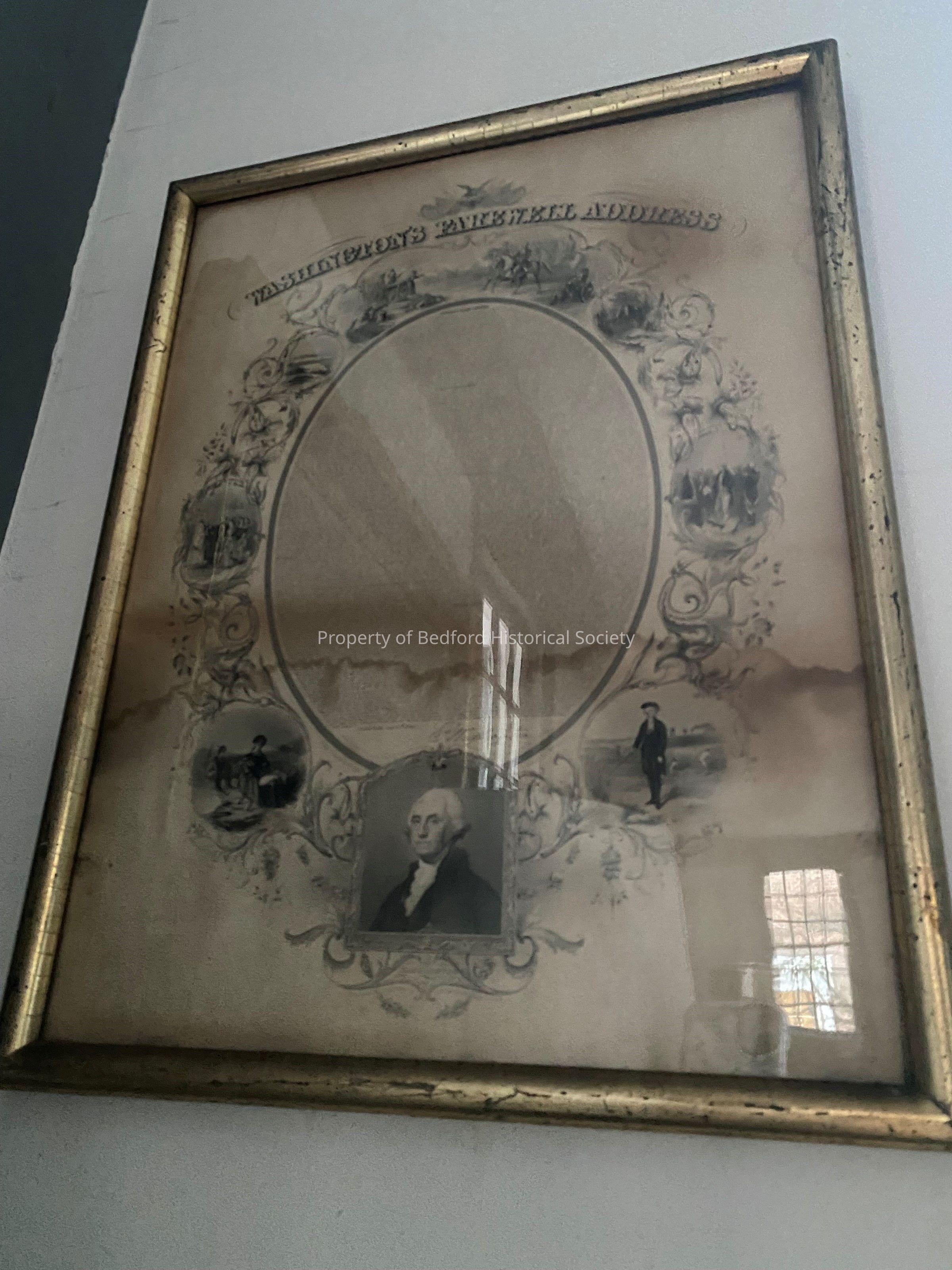Print of Washington's Farewell Address with decorative drawings of Washington's life surrounding oval in gold frame, 19th century. Gilt narrow frame.