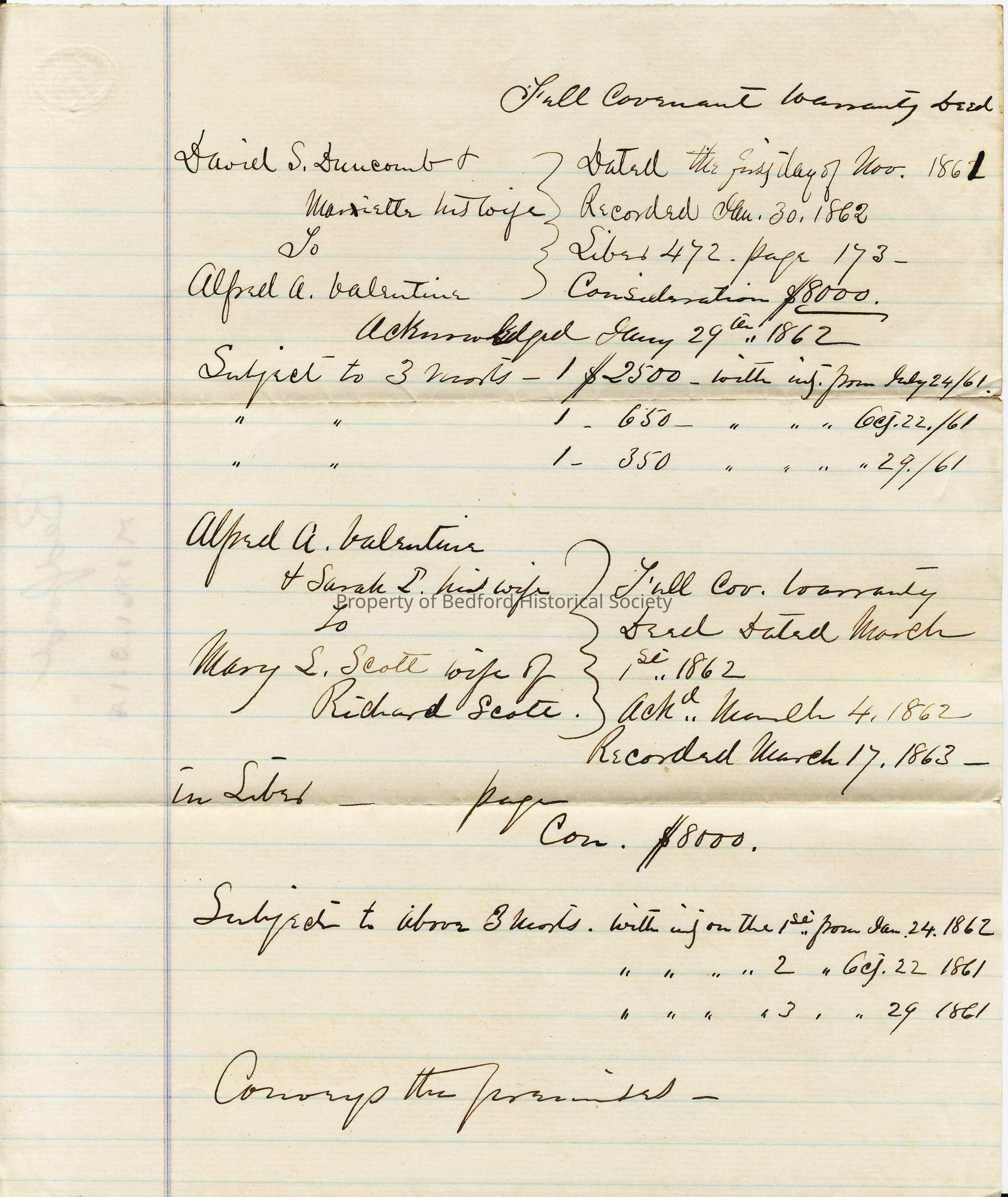 Full Covenant Warranty Deed: David S. Duncomb and wife to Alfred A. Valentine, 1861