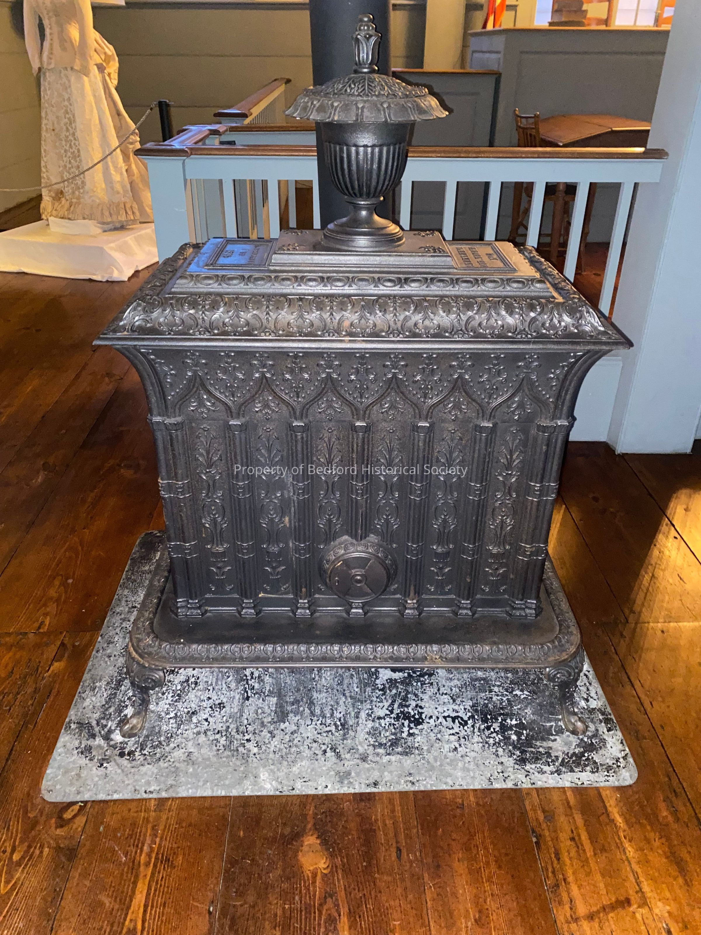Black Franklin furnace, model- Stanley's Air.tight #4, 1845. Cast iron heating stove with urn shaped covered water vessel. Cathedral inspired raised designs. Four (4) cabriole legs by Poultney.