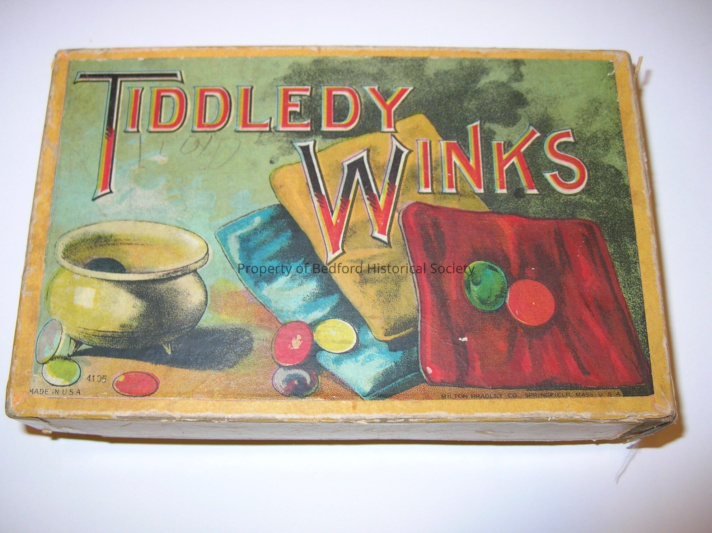 Tiddledy Winks game in yellow box. Hand written inscription, lloyd, on box top