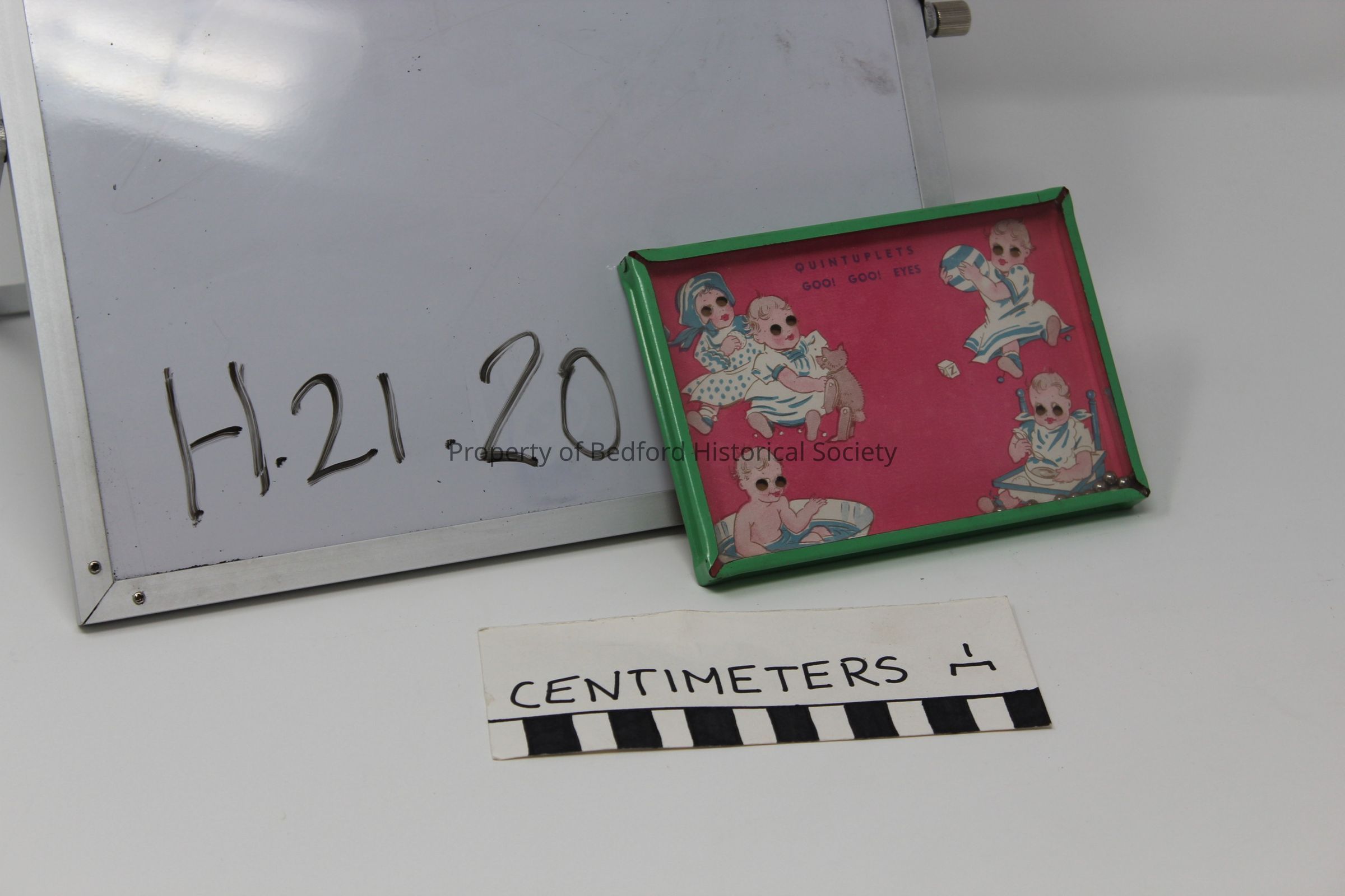 lithographed tin game board with pink background, illustrations of 5 babies in white and blue clothing playing, eating, bathing, with holes in eyes for balls to go into, 5 x 3 1/2 in.
