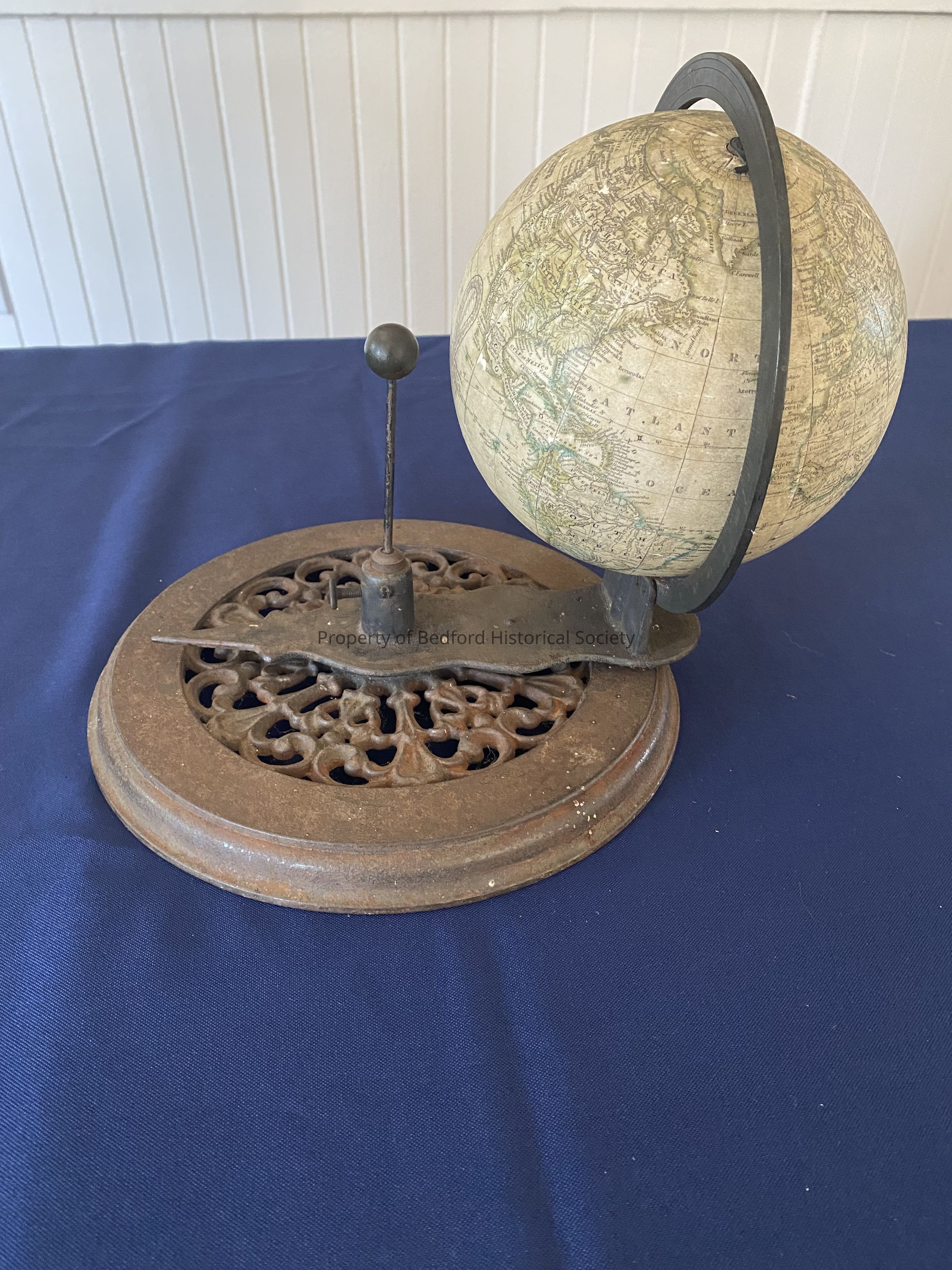 Child's educational globe by Joslin’s, 6” diameter terrestrial globe on armature with moon, cast iron base, meant to teach rotation of earth, 1854 9.5" high, 9" diameter of base